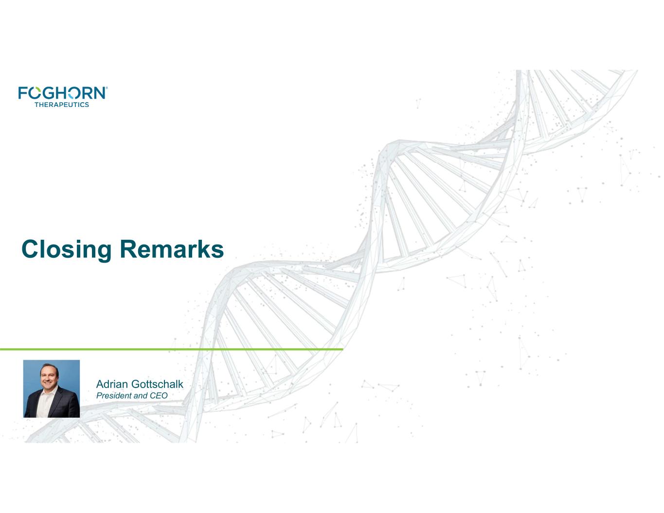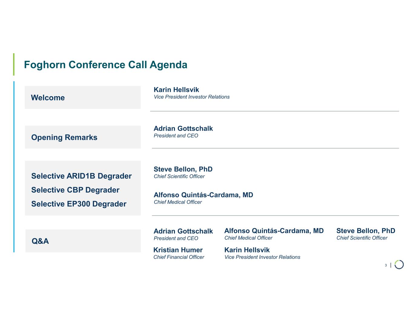 | Foghorn Conference Call Agenda Opening Remarks Welcome Selective ARID1B Degrader Selective CBP Degrader Selective EP300 Degrader Karin Hellsvik Vice President Investor Relations Adrian Gottschalk President and CEO Alfonso Quintás-Cardama, MD Chief Medical Officer Steve Bellon, PhD Chief Scientific Officer 3 Q&A Steve Bellon, PhD Chief Scientific Officer Adrian Gottschalk President and CEO Alfonso Quintás-Cardama, MD Chief Medical Officer Kristian Humer Chief Financial Officer Karin Hellsvik Vice President Investor Relations