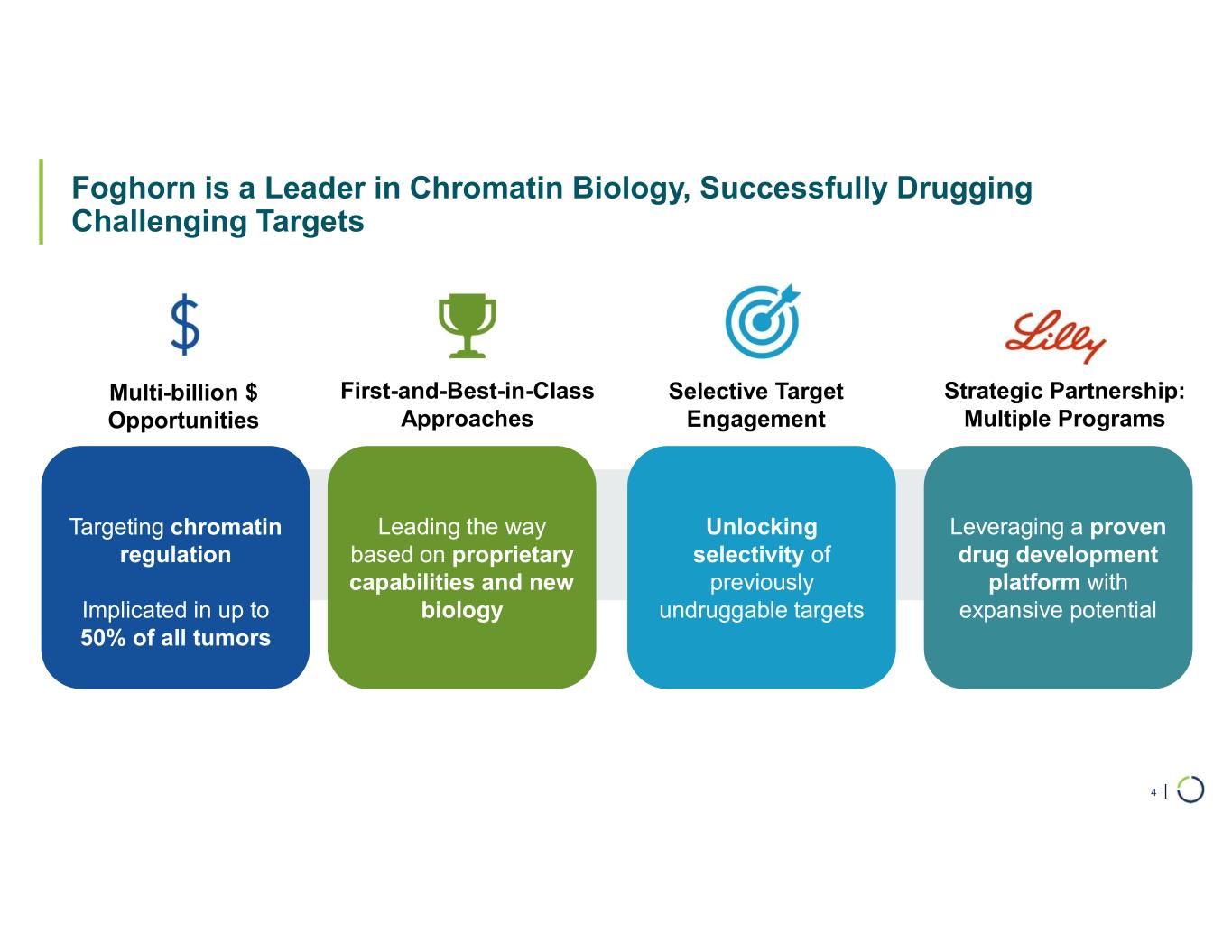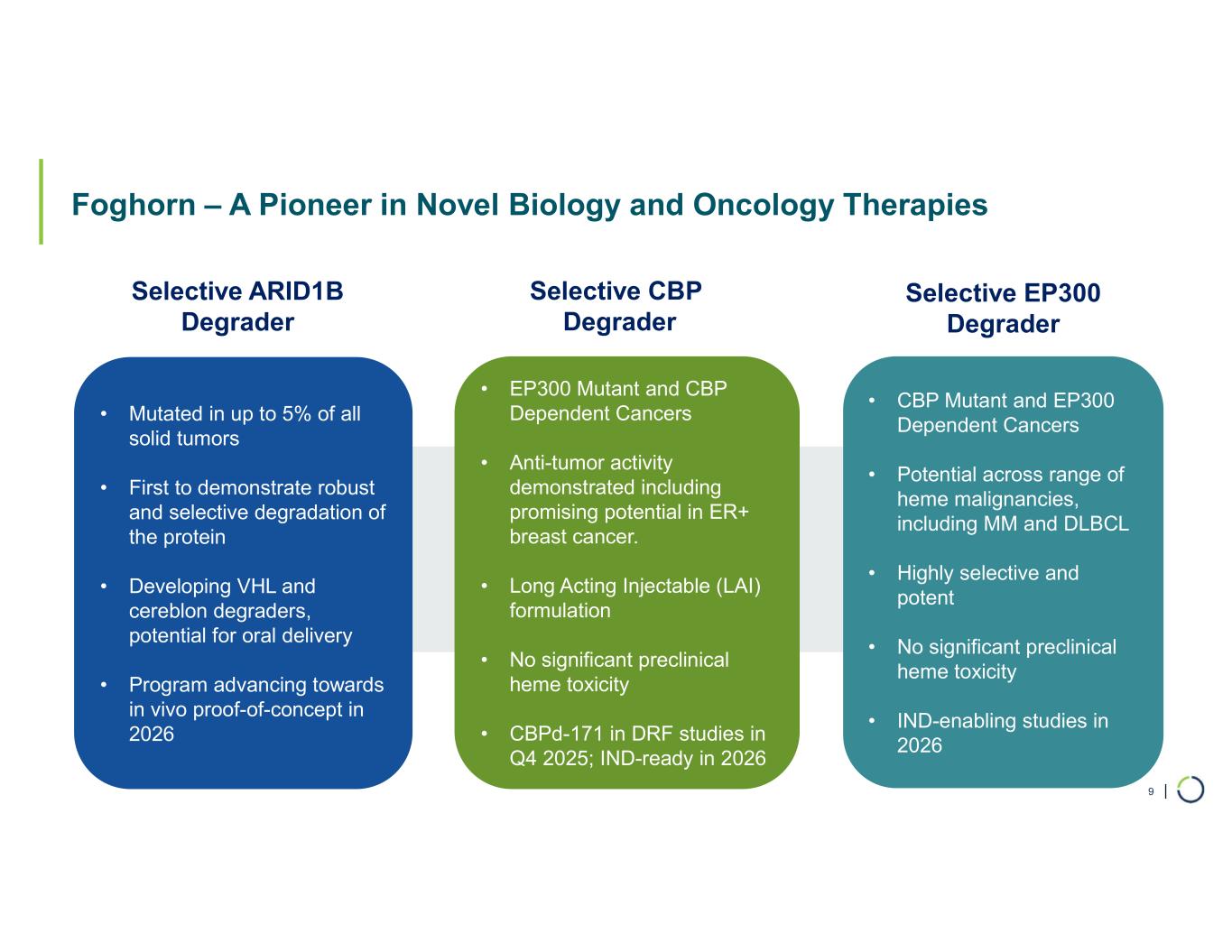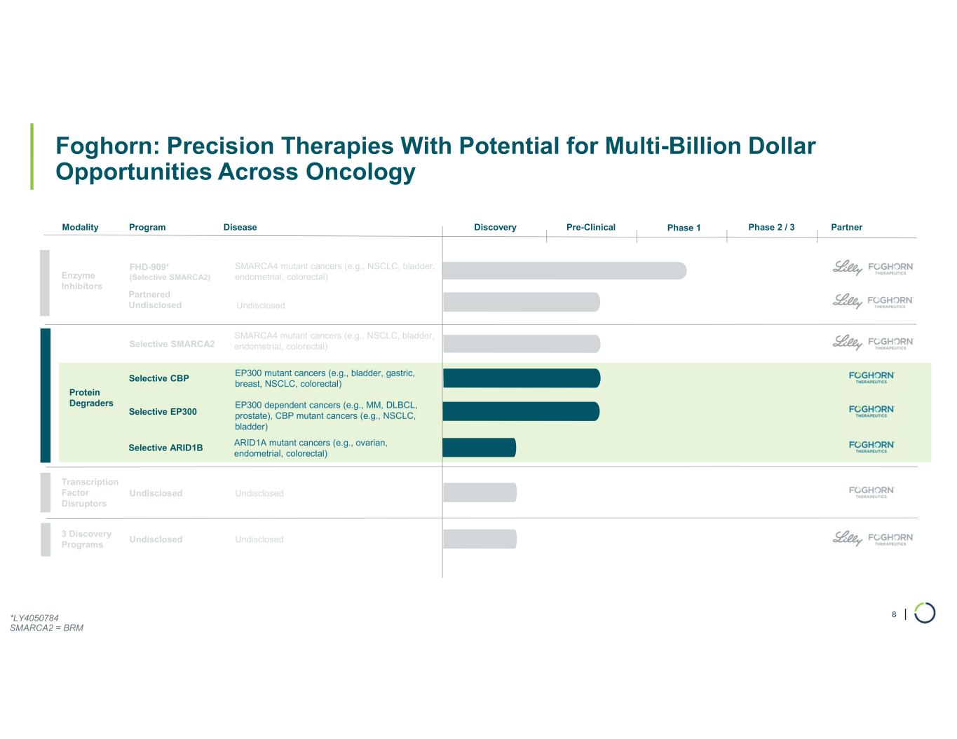| Foghorn: Precision Therapies With Potential for Multi-Billion Dollar Opportunities Across Oncology 8 Modality Program Phase 1 Enzyme Inhibitors Transcription Factor Disruptors Undisclosed Partner FHD-909* (Selective SMARCA2) 3 Discovery Programs Undisclosed Partnered Undisclosed Disease SMARCA4 mutant cancers (e.g., NSCLC, bladder, endometrial, colorectal) Selective SMARCA2 SMARCA4 mutant cancers (e.g., NSCLC, bladder, endometrial, colorectal) Selective CBP EP300 mutant cancers (e.g., bladder, gastric, breast, NSCLC, colorectal) Undisclosed Undisclosed Undisclosed Pre-Clinical Phase 2 / 3Discovery *LY4050784 SMARCA2 = BRM Selective EP300 EP300 dependent cancers (e.g., MM, DLBCL, prostate), CBP mutant cancers (e.g., NSCLC, bladder) Selective ARID1B ARID1A mutant cancers (e.g., ovarian, endometrial, colorectal) Protein Degraders