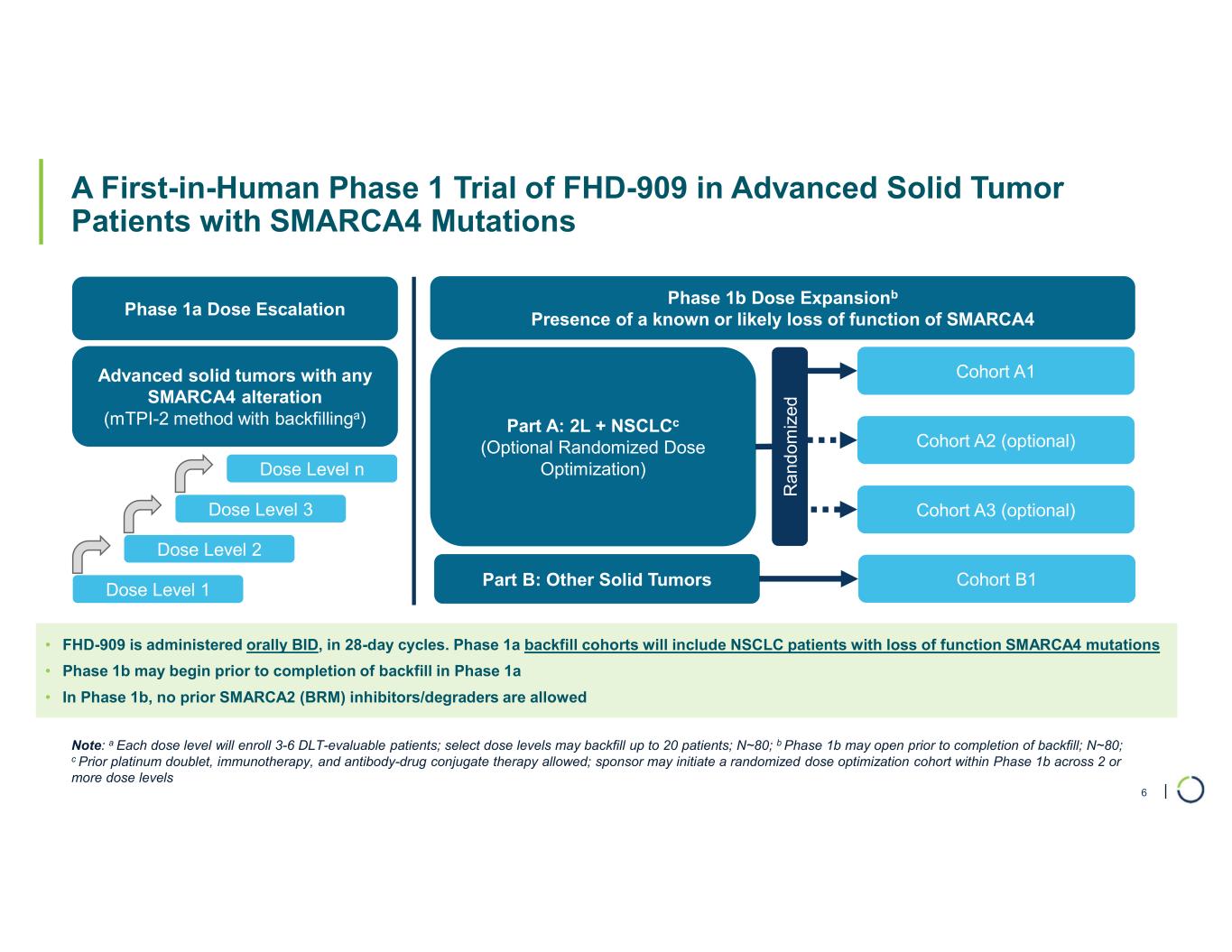 | A First-in-Human Phase 1 Trial of FHD-909 in Advanced Solid Tumor Patients with SMARCA4 Mutations Phase 1a Dose Escalation Advanced solid tumors with any SMARCA4 alteration (mTPI-2 method with backfillinga) Dose Level 1 Dose Level 2 Dose Level 3 Dose Level n Phase 1b Dose Expansionb Presence of a known or likely loss of function of SMARCA4 Part A: 2L + NSCLCc (Optional Randomized Dose Optimization) Part B: Other Solid Tumors Cohort A1 Cohort A2 (optional) Cohort A3 (optional) R an d om iz ed Cohort B1 • FHD-909 is administered orally BID, in 28-day cycles. Phase 1a backfill cohorts will include NSCLC patients with loss of function SMARCA4 mutations • Phase 1b may begin prior to completion of backfill in Phase 1a • In Phase 1b, no prior SMARCA2 (BRM) inhibitors/degraders are allowed Note: a Each dose level will enroll 3-6 DLT-evaluable patients; select dose levels may backfill up to 20 patients; N~80; b Phase 1b may open prior to completion of backfill; N~80; c Prior platinum doublet, immunotherapy, and antibody-drug conjugate therapy allowed; sponsor may initiate a randomized dose optimization cohort within Phase 1b across 2 or more dose levels 6
