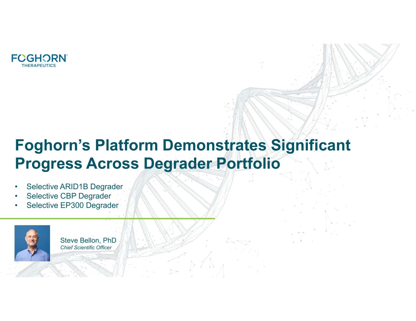 Foghorn’s Platform Demonstrates Significant Progress Across Degrader Portfolio • Selective ARID1B Degrader • Selective CBP Degrader • Selective EP300 Degrader Steve Bellon, PhD Chief Scientific Officer