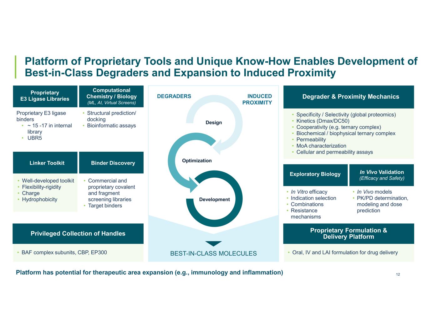 13 Platform of Proprietary Tools and Unique Know-How Enables Development of Best-in-Class Degraders and Expansion to Induced Proximity DEGRADERS INDUCED PROXIMITY Design Optimization Development BEST-IN-CLASS MOLECULES Proprietary E3 ligase binders • ~ 15 -17 in internal library • UBR5 • Well-developed toolkit • Flexibility-rigidity • Charge • Hydrophobicity Proprietary E3 Ligase Libraries Linker Toolkit • Structural prediction/ docking • Bioinformatic assays Computational Chemistry / Biology (ML, AI, Virtual Screens) • BAF complex subunits, CBP, EP300 Privileged Collection of Handles • Commercial and proprietary covalent and fragment screening libraries • Target binders Binder Discovery Platform has potential for therapeutic area expansion (e.g., immunology and inflammation) • Specificity / Selectivity (global proteomics) • Kinetics (Dmax/DC50) • Cooperativity (e.g. ternary complex) • Biochemical / biophysical ternary complex • Permeability • MoA characterization • Cellular and permeability assays Degrader & Proximity Mechanics • In Vitro efficacy • Indication selection • Combinations • Resistance mechanisms Exploratory Biology • In Vivo models • PK/PD determination, modeling and dose prediction In Vivo Validation (Efficacy and Safety) • Oral, IV and LAI formulation for drug delivery Proprietary Formulation & Delivery Platform