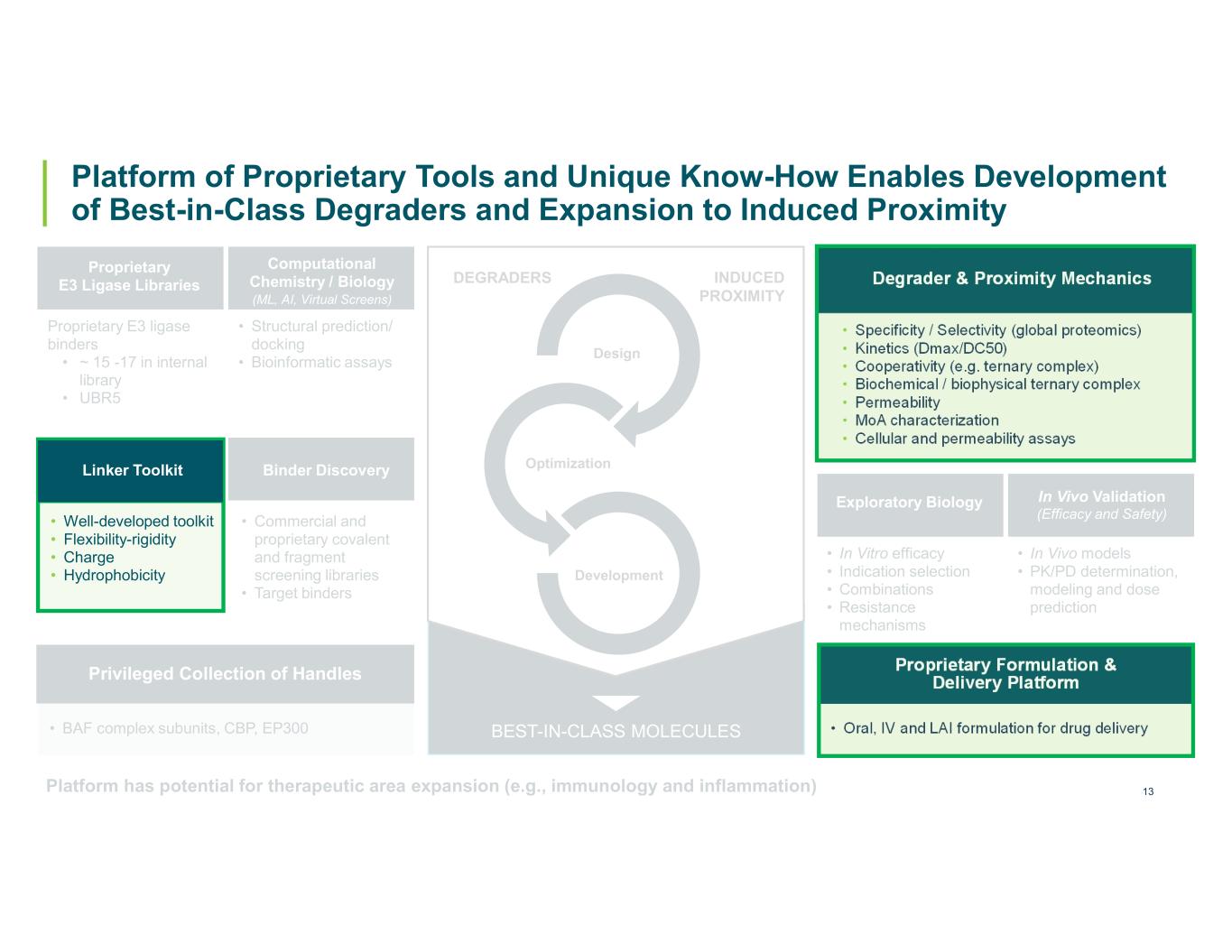 12 Platform of Proprietary Tools and Unique Know-How Enables Development of Best-in-Class Degraders and Expansion to Induced Proximity DEGRADERS INDUCED PROXIMITY Design Optimization Development BEST-IN-CLASS MOLECULES Proprietary E3 ligase binders • ~ 15 -17 in internal library • UBR5 • Well-developed toolkit • Flexibility-rigidity • Charge • Hydrophobicity Proprietary E3 Ligase Libraries Linker Toolkit • Structural prediction/ docking • Bioinformatic assays Computational Chemistry / Biology (ML, AI, Virtual Screens) • BAF complex subunits, CBP, EP300 Privileged Collection of Handles • Commercial and proprietary covalent and fragment screening libraries • Target binders Binder Discovery Platform has potential for therapeutic area expansion (e.g., immunology and inflammation) • Specificity / Selectivity (global proteomics) • Kinetics (Dmax/DC50) • Cooperativity (e.g. ternary complex) • Biochemical / biophysical ternary complex • Permeability • MoA characterization • Cellular and permeability assays Degrader & Proximity Mechanics • In Vitro efficacy • Indication selection • Combinations • Resistance mechanisms Exploratory Biology • In Vivo models • PK/PD determination, modeling and dose prediction In Vivo Validation (Efficacy and Safety) • Oral, IV and LAI formulation for drug delivery Proprietary Formulation & Delivery Platform