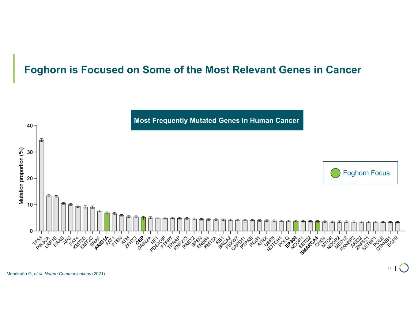 | Foghorn is Focused on Some of the Most Relevant Genes in Cancer 14 Mendiratta G, et al. Nature Communications (2021) Foghorn Focus Most Frequently Mutated Genes in Human Cancer Foghorn Focus