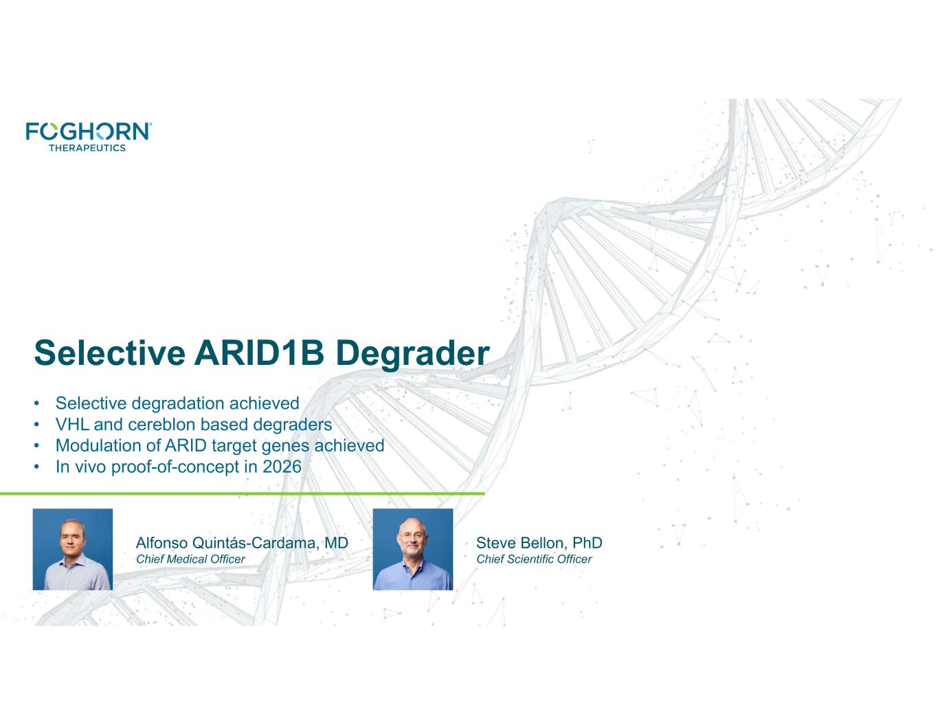 Alfonso Quintás-Cardama, MD Chief Medical Officer Selective ARID1B Degrader • Selective degradation achieved • VHL and cereblon based degraders • Modulation of ARID target genes achieved • In vivo proof-of-concept in 2026 Steve Bellon, PhD Chief Scientific Officer