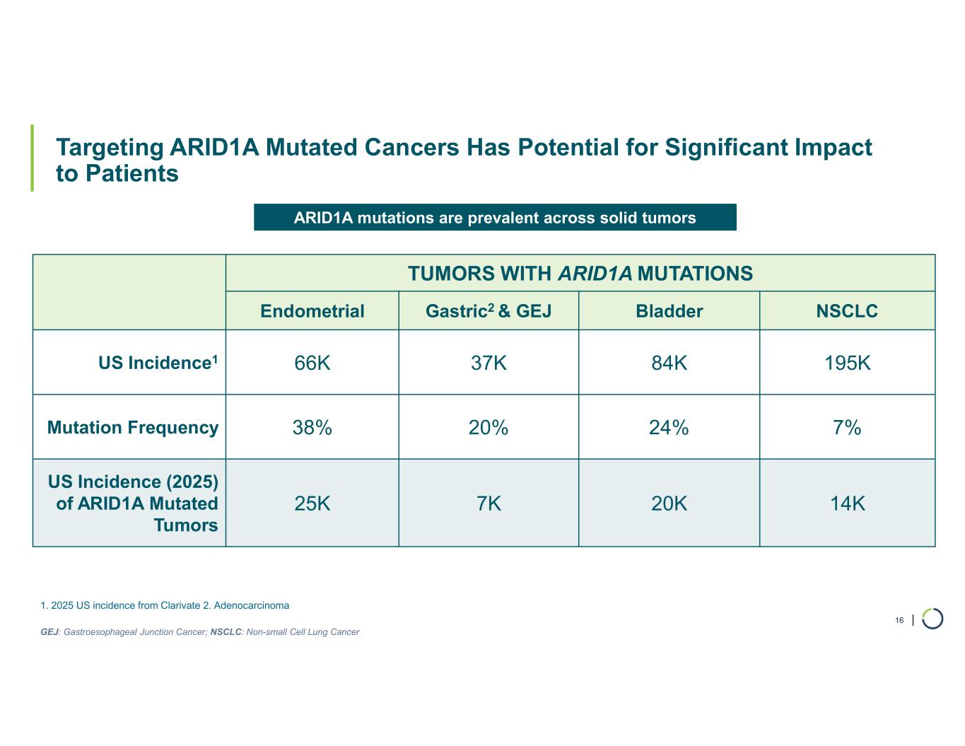 | Targeting ARID1A Mutated Cancers Has Potential for Significant Impact to Patients 16 TUMORS WITH ARID1A MUTATIONS NSCLCBladderGastric2 & GEJEndometrial 195K84K37K66KUS Incidence1 7%24%20%38%Mutation Frequency 14K20K7K25K US Incidence (2025) of ARID1A Mutated Tumors ARID1A mutations are prevalent across solid tumors 1. 2025 US incidence from Clarivate 2. Adenocarcinoma GEJ: Gastroesophageal Junction Cancer; NSCLC: Non-small Cell Lung Cancer