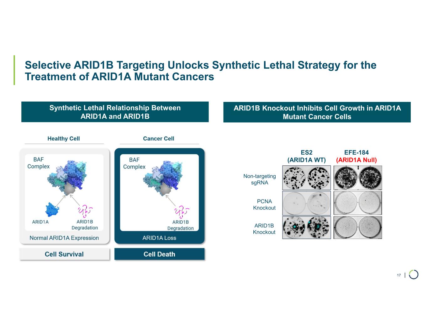 | Selective ARID1B Targeting Unlocks Synthetic Lethal Strategy for the Treatment of ARID1A Mutant Cancers 17 Synthetic Lethal Relationship Between ARID1A and ARID1B ARID1B Knockout Inhibits Cell Growth in ARID1A Mutant Cancer Cells EFE-184 (ARID1A Null) Non-targeting sgRNA ES2 (ARID1A WT) PCNA Knockout ARID1B Knockout
