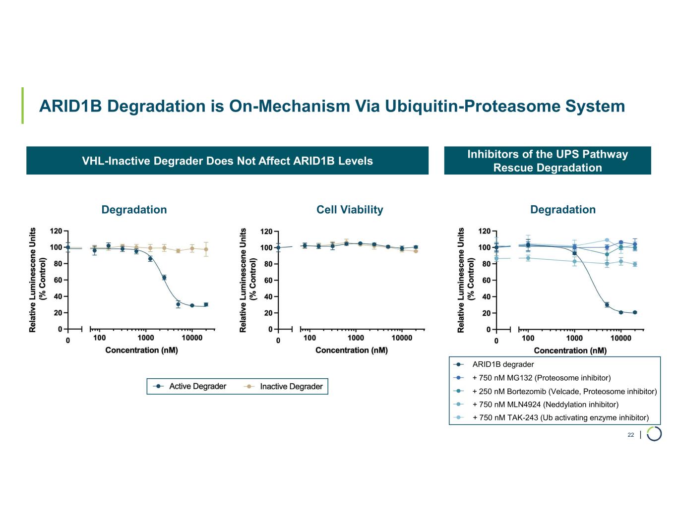 | ARID1B Degradation is On-Mechanism Via Ubiquitin-Proteasome System 22 Inhibitors of the UPS Pathway Rescue Degradation VHL-Inactive Degrader Does Not Affect ARID1B Levels Degradation Cell Viability Degradation + 750 nM MG132 (Proteosome inhibitor) + 250 nM Bortezomib (Velcade, Proteosome inhibitor) + 750 nM MLN4924 (Neddylation inhibitor) + 750 nM TAK-243 (Ub activating enzyme inhibitor) ARID1B degrader