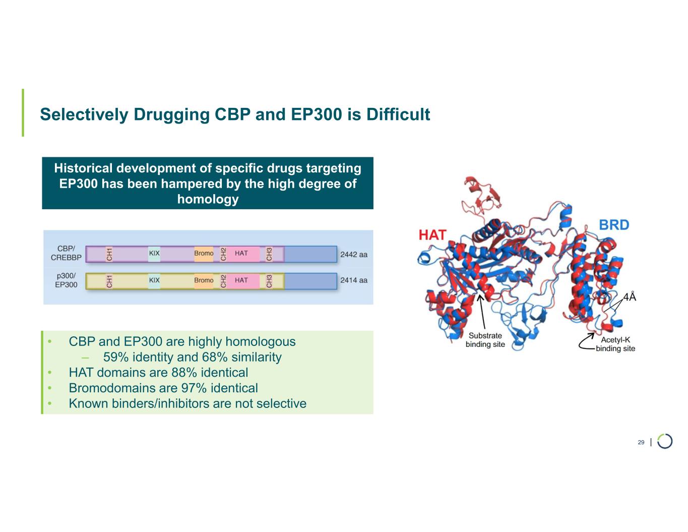 | Selectively Drugging CBP and EP300 is Difficult 29 Historical development of specific drugs targeting EP300 has been hampered by the high degree of homology • CBP and EP300 are highly homologous ‒ 59% identity and 68% similarity • HAT domains are 88% identical • Bromodomains are 97% identical • Known binders/inhibitors are not selective