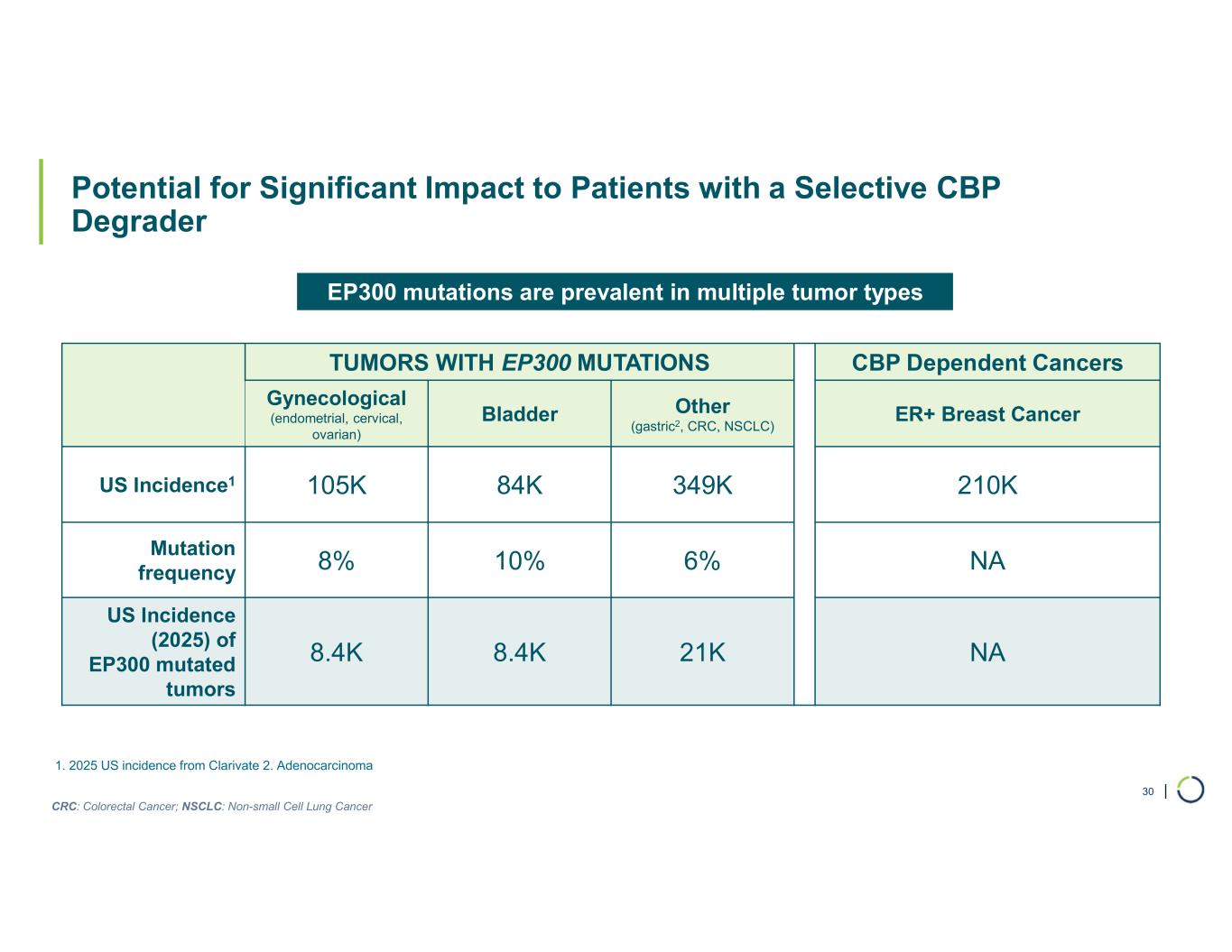 | Potential for Significant Impact to Patients with a Selective CBP Degrader 30 CBP Dependent CancersTUMORS WITH EP300 MUTATIONS ER+ Breast CancerOther (gastric2, CRC, NSCLC) Bladder Gynecological (endometrial, cervical, ovarian) 210K349K84K105KUS Incidence1 NA6%10%8% Mutation frequency NA21K8.4K8.4K US Incidence (2025) of EP300 mutated tumors EP300 mutations are prevalent in multiple tumor types 1. 2025 US incidence from Clarivate 2. Adenocarcinoma CRC: Colorectal Cancer; NSCLC: Non-small Cell Lung Cancer