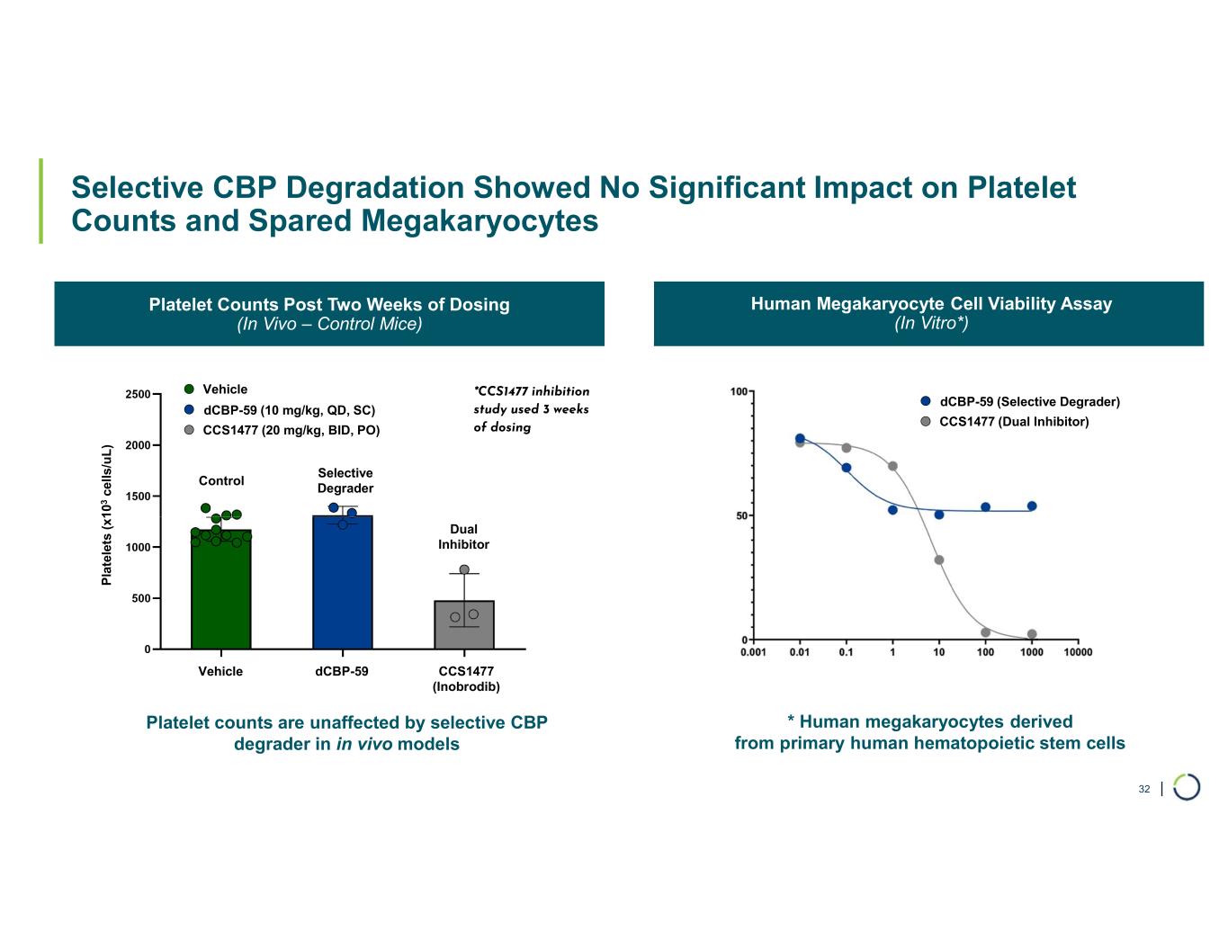 | Selective CBP Degradation Showed No Significant Impact on Platelet Counts and Spared Megakaryocytes 32 Platelet Counts Post Two Weeks of Dosing (In Vivo – Control Mice) Human Megakaryocyte Cell Viability Assay (In Vitro*) dCBP-59 CCS1477 (Inobrodib) Vehicle dCBP-59 (10 mg/kg, QD, SC) Vehicle CCS1477 (20 mg/kg, BID, PO) Dual Inhibitor Selective Degrader Control P la te le ts ( x1 03 ce lls /u L ) *CCS1477 inhibition study used 3 weeks of dosing dCBP-59 (Selective Degrader) CCS1477 (Dual Inhibitor) Platelet counts are unaffected by selective CBP degrader in in vivo models * Human megakaryocytes derived from primary human hematopoietic stem cells