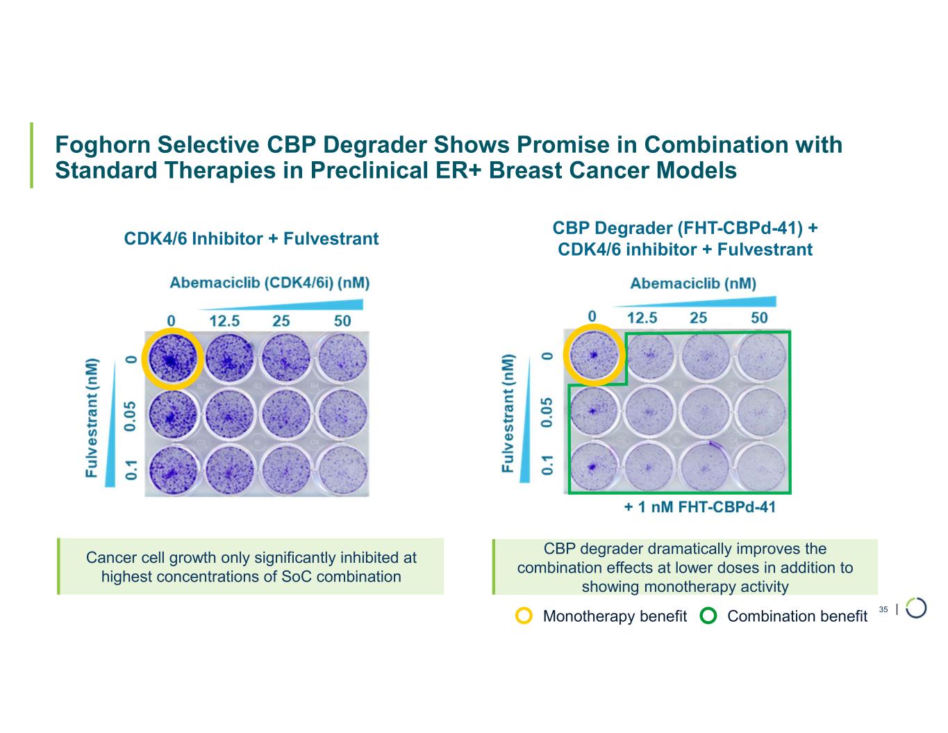 | Foghorn Selective CBP Degrader Shows Promise in Combination with Standard Therapies in Preclinical ER+ Breast Cancer Models 35 CDK4/6 Inhibitor + Fulvestrant CBP Degrader (FHT-CBPd-41) + CDK4/6 inhibitor + Fulvestrant Cancer cell growth only significantly inhibited at highest concentrations of SoC combination CBP degrader dramatically improves the combination effects at lower doses in addition to showing monotherapy activity Monotherapy benefit Combination benefit