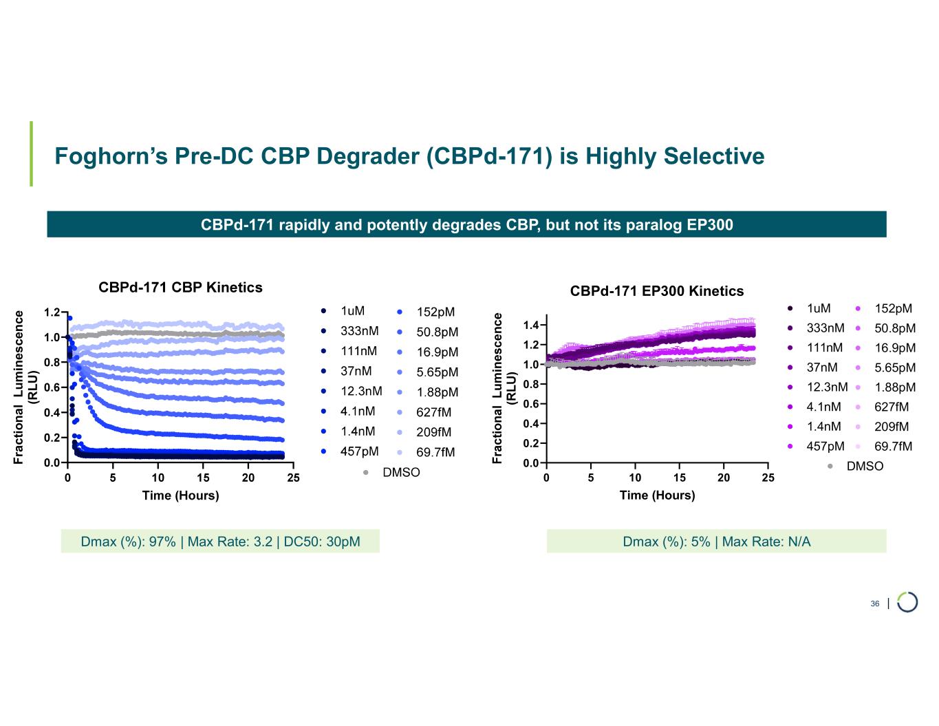 | Foghorn’s Pre-DC CBP Degrader (CBPd-171) is Highly Selective 36 CBPd-171 rapidly and potently degrades CBP, but not its paralog EP300 Dmax (%): 97% | Max Rate: 3.2 | DC50: 30pM Dmax (%): 5% | Max Rate: N/A F ra c ti o n a l L u m in e s c en ce (R L U ) 0 5 10 15 20 25 0.0 0.2 0.4 0.6 0.8 1.0 1.2 1.4 CBPd-171 EP300 Kinetics Time (Hours) DMSO 1uM 333nM 111nM 37nM 12.3nM 4.1nM 1.4nM 457pM 152pM 50.8pM 16.9pM 5.65pM 1.88pM 627fM 209fM 69.7fM