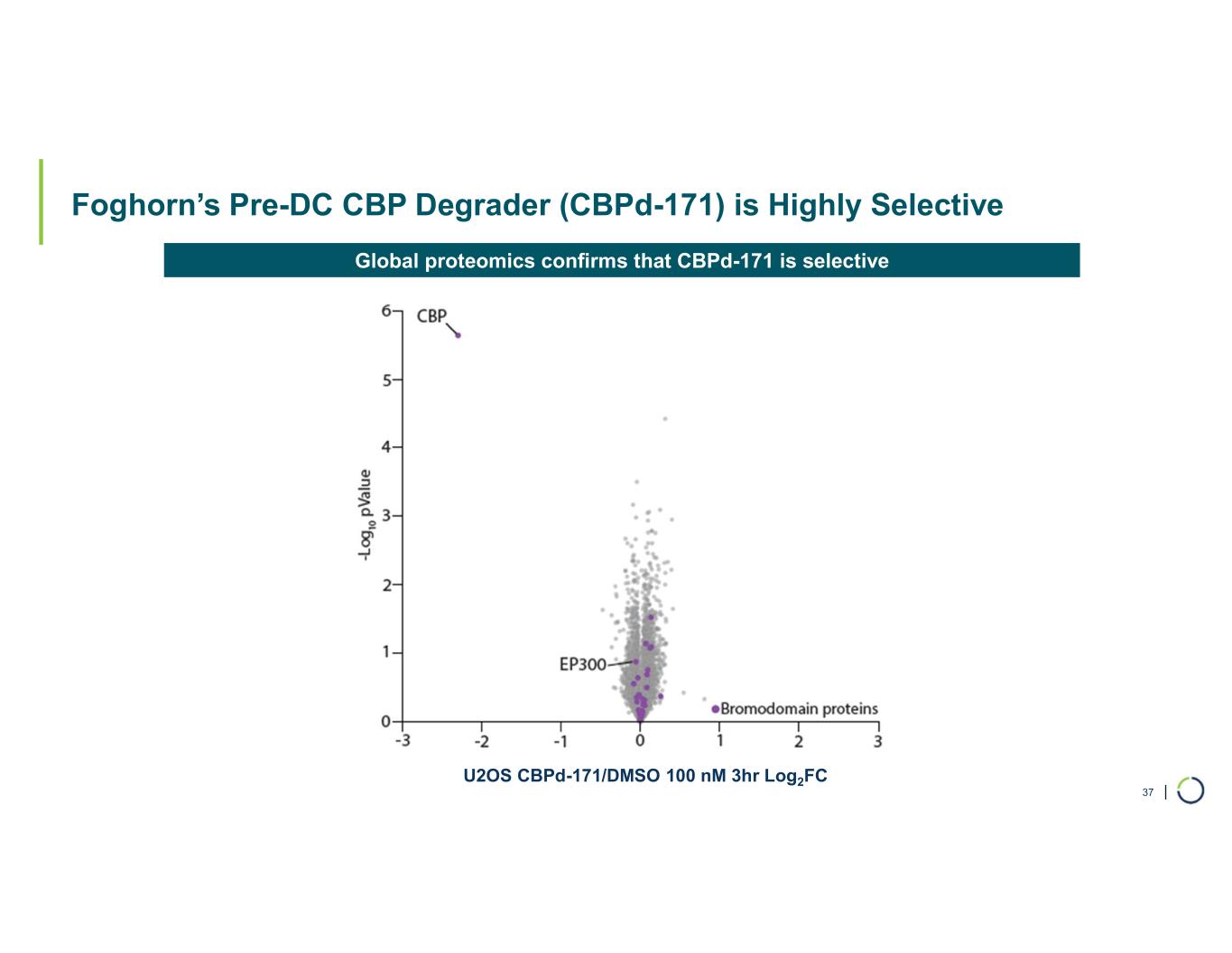 | Foghorn’s Pre-DC CBP Degrader (CBPd-171) is Highly Selective 37 U2OS CBPd-171/DMSO 100 nM 3hr Log2FC Global proteomics confirms that CBPd-171 is selective