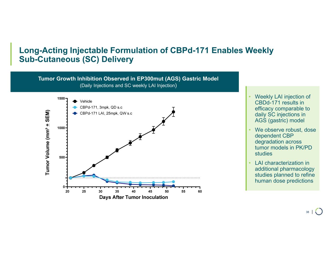 | Long-Acting Injectable Formulation of CBPd-171 Enables Weekly Sub-Cutaneous (SC) Delivery 38 Tumor Growth Inhibition Observed in EP300mut (AGS) Gastric Model (Daily Injections and SC weekly LAI Injection) • Weekly LAI injection of CBDd-171 results in efficacy comparable to daily SC injections in AGS (gastric) model • We observe robust, dose dependent CBP degradation across tumor models in PK/PD studies • LAI characterization in additional pharmacology studies planned to refine human dose predictions T u m o r V o lu m e (m m ³ + S E M )