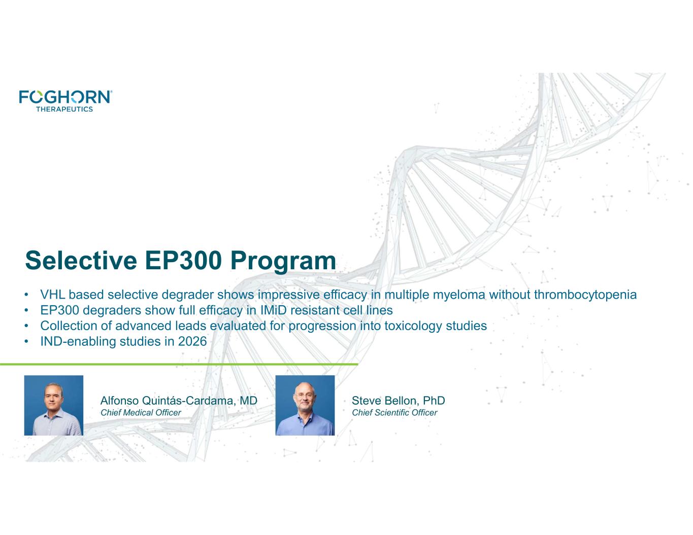 Alfonso Quintás-Cardama, MD Chief Medical Officer Selective EP300 Program • VHL based selective degrader shows impressive efficacy in multiple myeloma without thrombocytopenia • EP300 degraders show full efficacy in IMiD resistant cell lines • Collection of advanced leads evaluated for progression into toxicology studies • IND-enabling studies in 2026 Steve Bellon, PhD Chief Scientific Officer