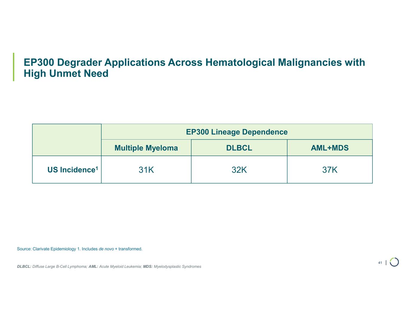 | EP300 Degrader Applications Across Hematological Malignancies with High Unmet Need 41 Source: Clarivate Epidemiology 1. Includes de novo + transformed. EP300 Lineage Dependence AML+MDSDLBCLMultiple Myeloma 37K32K31KUS Incidence1 DLBCL: Diffuse Large B-Cell Lymphoma; AML: Acute Myeloid Leukemia; MDS: Myelodysplastic Syndromes