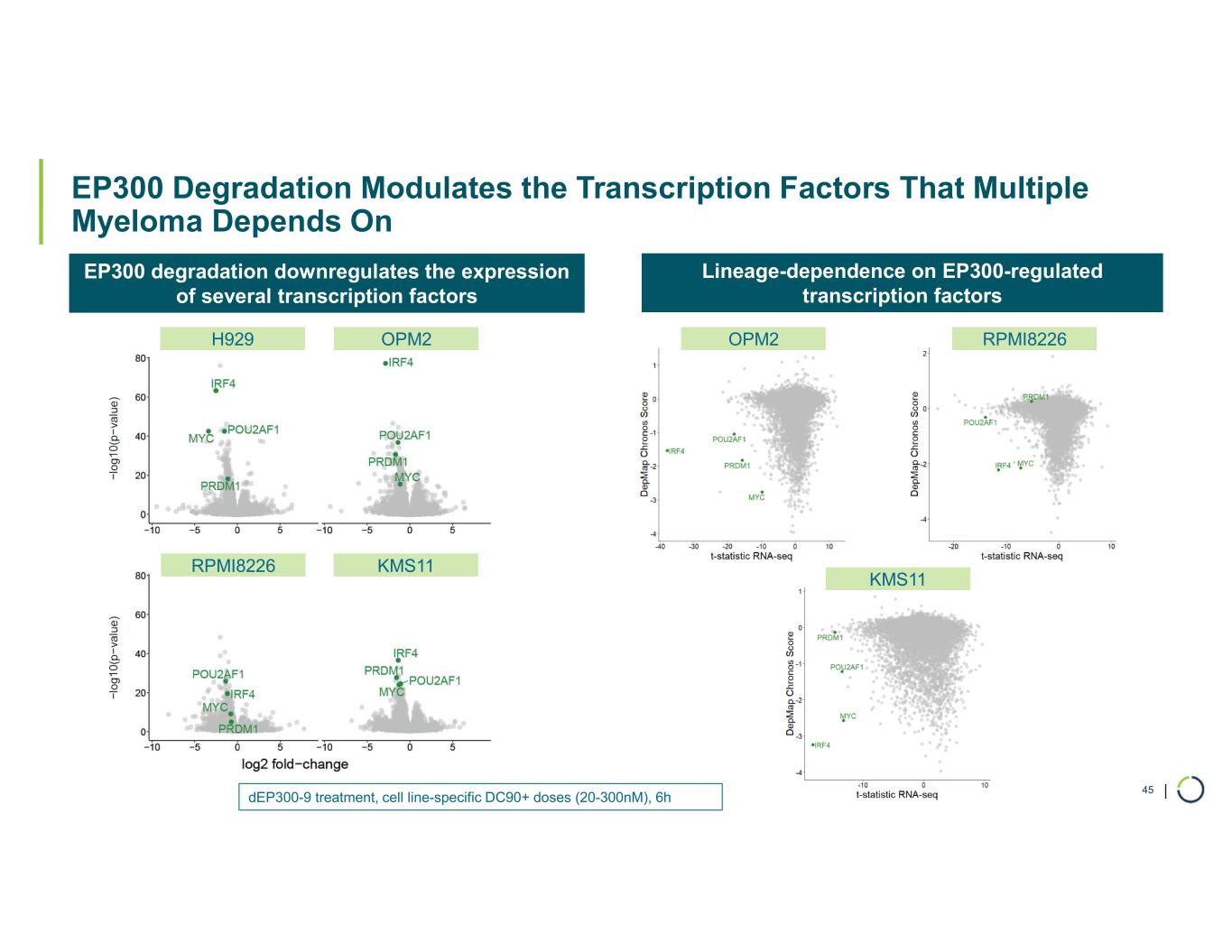 | EP300 Degradation Modulates the Transcription Factors That Multiple Myeloma Depends On 45 EP300 degradation downregulates the expression of several transcription factors H929 OPM2 Lineage-dependence on EP300-regulated transcription factors KMS11RPMI8226 OPM2 RPMI8226 KMS11 dEP300-9 treatment, cell line-specific DC90+ doses (20-300nM), 6h