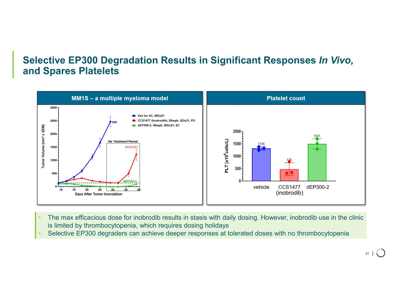 | Selective EP300 Degradation Results in Significant Responses In Vivo, and Spares Platelets 47 • The max efficacious dose for inobrodib results in stasis with daily dosing. However, inobrodib use in the clinic is limited by thrombocytopenia, which requires dosing holidays • Selective EP300 degraders can achieve deeper responses at tolerated doses with no thrombocytopenia (inobrodib)