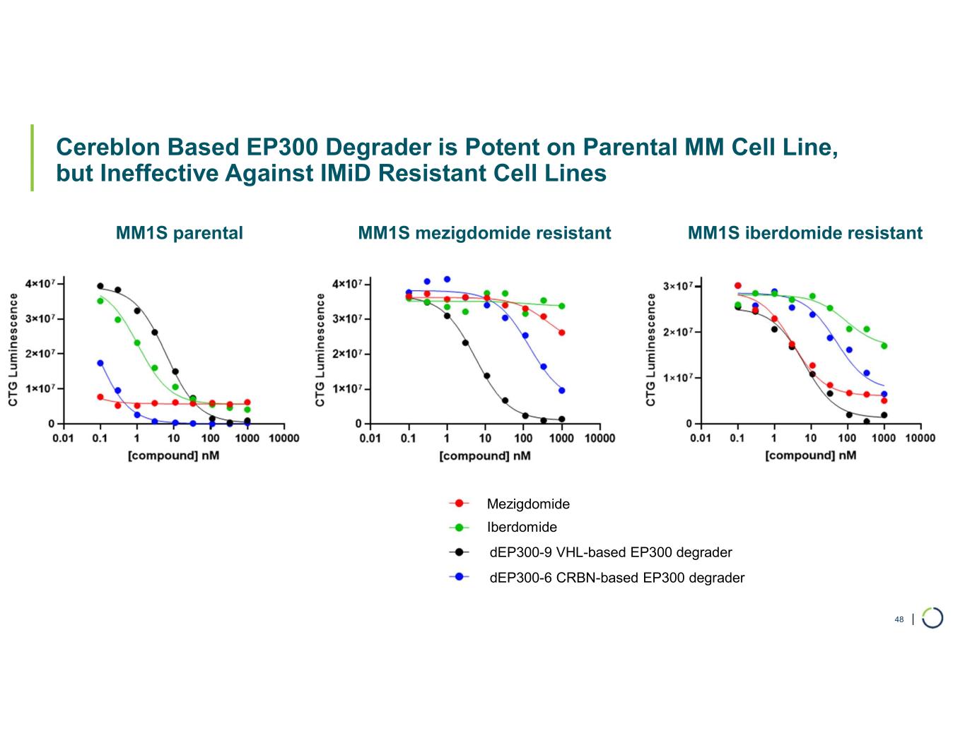 | Cereblon Based EP300 Degrader is Potent on Parental MM Cell Line, but Ineffective Against IMiD Resistant Cell Lines 48 dEP300-9 VHL-based EP300 degrader dEP300-6 CRBN-based EP300 degrader MM1S parental MM1S mezigdomide resistant MM1S iberdomide resistant Iberdomide Mezigdomide
