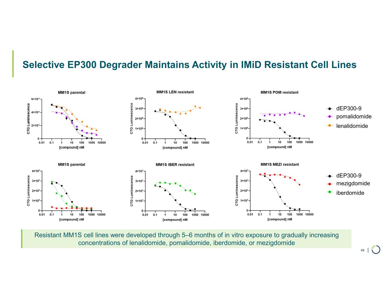 | Selective EP300 Degrader Maintains Activity in IMiD Resistant Cell Lines 49 Resistant MM1S cell lines were developed through 5–6 months of in vitro exposure to gradually increasing concentrations of lenalidomide, pomalidomide, iberdomide, or mezigdomide dEP300-9 dEP300-9 pomalidomide lenalidomide mezigdomide iberdomide