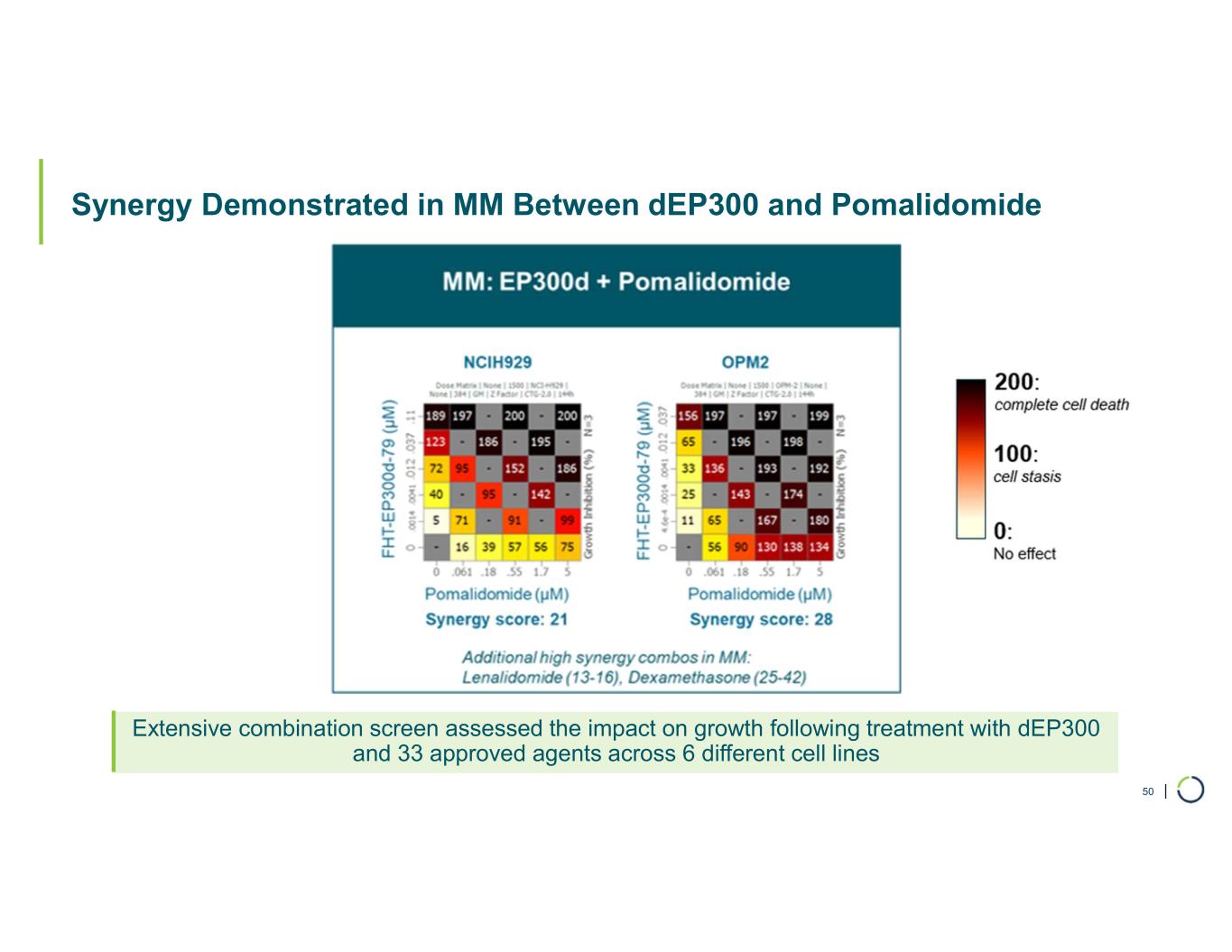 | Synergy Demonstrated in MM Between dEP300 and Pomalidomide 50 Extensive combination screen assessed the impact on growth following treatment with dEP300 and 33 approved agents across 6 different cell lines