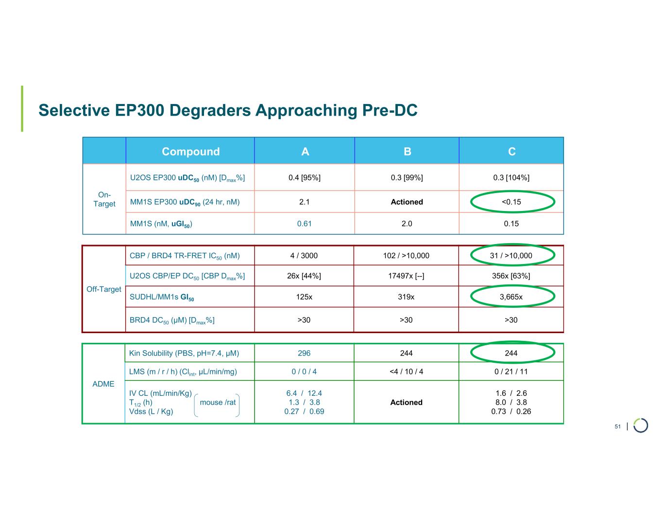 | Selective EP300 Degraders Approaching Pre-DC CBACompound 0.3 [104%]0.3 [99%]0.4 [95%]U2OS EP300 uDC50 (nM) [Dmax%] On- Target <0.15Actioned2.1MM1S EP300 uDC90 (24 hr, nM) 0.152.00.61MM1S (nM, uGI50) 31 / >10,000102 / >10,0004 / 3000CBP / BRD4 TR-FRET IC50 (nM) Off-Target 356x [63%]17497x [--]26x [44%]U2OS CBP/EP DC50 [CBP Dmax%] 3,665x319x125xSUDHL/MM1s GI50 >30>30>30BRD4 DC50 (µM) [Dmax%] 244244296Kin Solubility (PBS, pH=7.4, µM) ADME 0 / 21 / 11<4 / 10 / 40 / 0 / 4LMS (m / r / h) (Clint, µL/min/mg) 1.6 / 2.6 8.0 / 3.8 0.73 / 0.26 Actioned 6.4 / 12.4 1.3 / 3.8 0.27 / 0.69 IV CL (mL/min/Kg) T1/2 (h) mouse /rat Vdss (L / Kg) 51