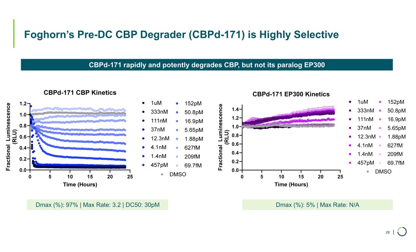 | Foghorn’s Selective EP300 Degraders (EP300d) are Highly Potent and Selective 33 Dmax (%): 95% | Max Rate: 2.5 | DC50: 3nM Dmax (%): 5% | Max Rate: N/A EP300 Cellular Kinetics CBP Cellular Kinetics EP300d-31 rapidly and potently degrades EP300, but not its paralog CBP