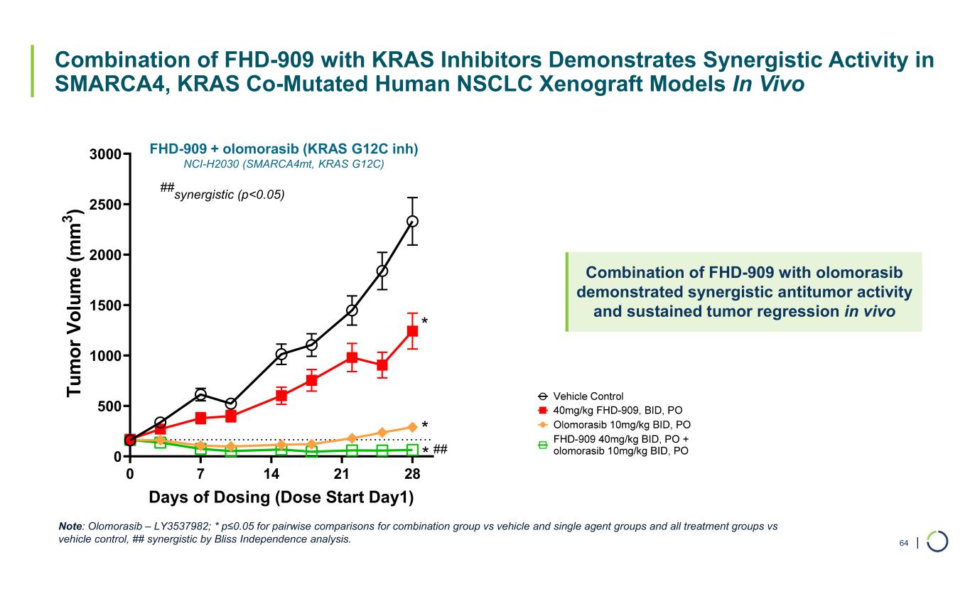 | Combination of FHD-909 with KRAS Inhibitors Demonstrates Synergistic Activity in SMARCA4, KRAS Co-Mutated Human NSCLC Xenograft Models In Vivo FHD-909 + olomorasib (KRAS G12C inh) NCI-H2030 (SMARCA4mt, KRAS G12C) 64 0 7 14 21 28 0 500 1000 1500 2000 2500 3000 Days of Dosing (Dose Start Day1) T u m o r V o lu m e (m m 3 ) ## synergistic (p<0.05) * * * ## Combination of FHD-909 with olomorasib demonstrated synergistic antitumor activity and sustained tumor regression in vivo Note: Olomorasib – LY3537982; * p≤0.05 for pairwise comparisons for combination group vs vehicle and single agent groups and all treatment groups vs vehicle control, ## synergistic by Bliss Independence analysis.
