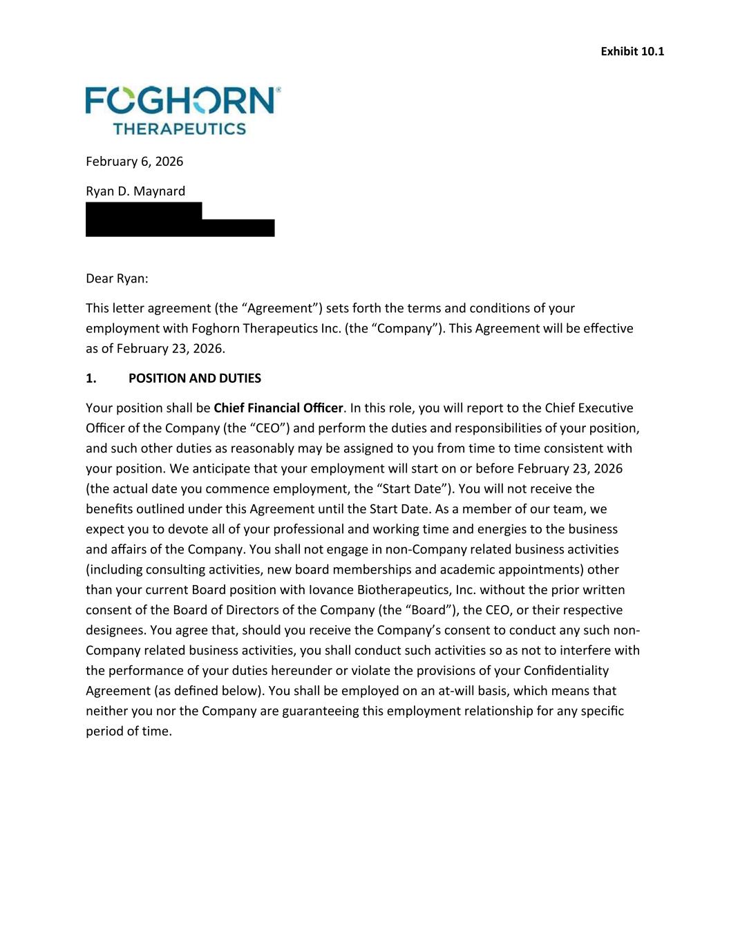 Exhibit 10.1 February 6, 2026 Ryan D. Maynard 254 Canoe Hill Road New Canaan, Connecticut 06840 Dear Ryan: This letter agreement (the “Agreement”) sets forth the terms and conditions of your employment with Foghorn Therapeutics Inc. (the “Company”). This Agreement will be effective as of February 23, 2026. 1. POSITION AND DUTIES Your position shall be Chief Financial Officer. In this role, you will report to the Chief Executive Officer of the Company (the “CEO”) and perform the duties and responsibilities of your position, and such other duties as reasonably may be assigned to you from time to time consistent with your position. We anticipate that your employment will start on or before February 23, 2026 (the actual date you commence employment, the “Start Date”). You will not receive the benefits outlined under this Agreement until the Start Date. As a member of our team, we expect you to devote all of your professional and working time and energies to the business and affairs of the Company. You shall not engage in non-Company related business activities (including consulting activities, new board memberships and academic appointments) other than your current Board position with Iovance Biotherapeutics, Inc. without the prior written consent of the Board of Directors of the Company (the “Board”), the CEO, or their respective designees. You agree that, should you receive the Company’s consent to conduct any such non- Company related business activities, you shall conduct such activities so as not to interfere with the performance of your duties hereunder or violate the provisions of your Confidentiality Agreement (as defined below). You shall be employed on an at-will basis, which means that neither you nor the Company are guaranteeing this employment relationship for any specific period of time.