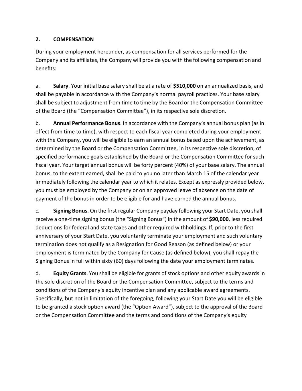 2. COMPENSATION During your employment hereunder, as compensation for all services performed for the Company and its affiliates, the Company will provide you with the following compensation and benefits: a. Salary. Your initial base salary shall be at a rate of $510,000 on an annualized basis, and shall be payable in accordance with the Company’s normal payroll practices. Your base salary shall be subject to adjustment from time to time by the Board or the Compensation Committee of the Board (the “Compensation Committee”), in its respective sole discretion. b. Annual Performance Bonus. In accordance with the Company’s annual bonus plan (as in effect from time to time), with respect to each fiscal year completed during your employment with the Company, you will be eligible to earn an annual bonus based upon the achievement, as determined by the Board or the Compensation Committee, in its respective sole discretion, of specified performance goals established by the Board or the Compensation Committee for such fiscal year. Your target annual bonus will be forty percent (40%) of your base salary. The annual bonus, to the extent earned, shall be paid to you no later than March 15 of the calendar year immediately following the calendar year to which it relates. Except as expressly provided below, you must be employed by the Company or on an approved leave of absence on the date of payment of the bonus in order to be eligible for and have earned the annual bonus. c. Signing Bonus. On the first regular Company payday following your Start Date, you shall receive a one-time signing bonus (the “Signing Bonus”) in the amount of $90,000, less required deductions for federal and state taxes and other required withholdings. If, prior to the first anniversary of your Start Date, you voluntarily terminate your employment and such voluntary termination does not qualify as a Resignation for Good Reason (as defined below) or your employment is terminated by the Company for Cause (as defined below), you shall repay the Signing Bonus in full within sixty (60) days following the date your employment terminates. d. Equity Grants. You shall be eligible for grants of stock options and other equity awards in the sole discretion of the Board or the Compensation Committee, subject to the terms and conditions of the Company’s equity incentive plan and any applicable award agreements. Specifically, but not in limitation of the foregoing, following your Start Date you will be eligible to be granted a stock option award (the “Option Award”), subject to the approval of the Board or the Compensation Committee and the terms and conditions of the Company’s equity