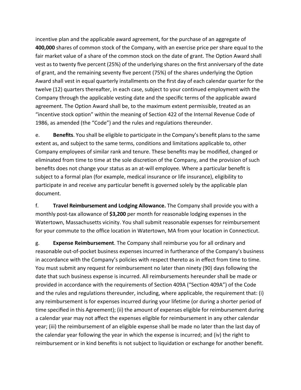 incentive plan and the applicable award agreement, for the purchase of an aggregate of 400,000 shares of common stock of the Company, with an exercise price per share equal to the fair market value of a share of the common stock on the date of grant. The Option Award shall vest as to twenty five percent (25%) of the underlying shares on the first anniversary of the date of grant, and the remaining seventy five percent (75%) of the shares underlying the Option Award shall vest in equal quarterly installments on the first day of each calendar quarter for the twelve (12) quarters thereafter, in each case, subject to your continued employment with the Company through the applicable vesting date and the specific terms of the applicable award agreement. The Option Award shall be, to the maximum extent permissible, treated as an “incentive stock option” within the meaning of Section 422 of the Internal Revenue Code of 1986, as amended (the “Code”) and the rules and regulations thereunder. e. Benefits. You shall be eligible to participate in the Company’s benefit plans to the same extent as, and subject to the same terms, conditions and limitations applicable to, other Company employees of similar rank and tenure. These benefits may be modified, changed or eliminated from time to time at the sole discretion of the Company, and the provision of such benefits does not change your status as an at-will employee. Where a particular benefit is subject to a formal plan (for example, medical insurance or life insurance), eligibility to participate in and receive any particular benefit is governed solely by the applicable plan document. f. Travel Reimbursement and Lodging Allowance. The Company shall provide you with a monthly post-tax allowance of $3,200 per month for reasonable lodging expenses in the Watertown, Massachusetts vicinity. You shall submit reasonable expenses for reimbursement for your commute to the office location in Watertown, MA from your location in Connecticut. g. Expense Reimbursement. The Company shall reimburse you for all ordinary and reasonable out-of-pocket business expenses incurred in furtherance of the Company’s business in accordance with the Company’s policies with respect thereto as in effect from time to time. You must submit any request for reimbursement no later than ninety (90) days following the date that such business expense is incurred. All reimbursements hereunder shall be made or provided in accordance with the requirements of Section 409A (“Section 409A”) of the Code and the rules and regulations thereunder, including, where applicable, the requirement that: (i) any reimbursement is for expenses incurred during your lifetime (or during a shorter period of time specified in this Agreement); (ii) the amount of expenses eligible for reimbursement during a calendar year may not affect the expenses eligible for reimbursement in any other calendar year; (iii) the reimbursement of an eligible expense shall be made no later than the last day of the calendar year following the year in which the expense is incurred; and (iv) the right to reimbursement or in kind benefits is not subject to liquidation or exchange for another benefit.