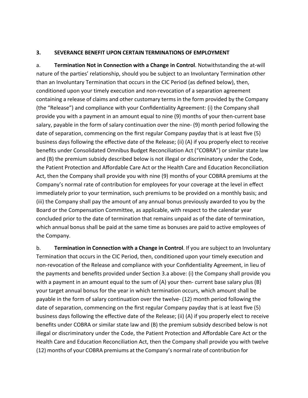 3. SEVERANCE BENEFIT UPON CERTAIN TERMINATIONS OF EMPLOYMENT a. Termination Not in Connection with a Change in Control. Notwithstanding the at-will nature of the parties’ relationship, should you be subject to an Involuntary Termination other than an Involuntary Termination that occurs in the CIC Period (as defined below), then, conditioned upon your timely execution and non-revocation of a separation agreement containing a release of claims and other customary terms in the form provided by the Company (the “Release”) and compliance with your Confidentiality Agreement: (i) the Company shall provide you with a payment in an amount equal to nine (9) months of your then-current base salary, payable in the form of salary continuation over the nine- (9) month period following the date of separation, commencing on the first regular Company payday that is at least five (5) business days following the effective date of the Release; (ii) (A) if you properly elect to receive benefits under Consolidated Omnibus Budget Reconciliation Act (“COBRA”) or similar state law and (B) the premium subsidy described below is not illegal or discriminatory under the Code, the Patient Protection and Affordable Care Act or the Health Care and Education Reconciliation Act, then the Company shall provide you with nine (9) months of your COBRA premiums at the Company’s normal rate of contribution for employees for your coverage at the level in effect immediately prior to your termination, such premiums to be provided on a monthly basis; and (iii) the Company shall pay the amount of any annual bonus previously awarded to you by the Board or the Compensation Committee, as applicable, with respect to the calendar year concluded prior to the date of termination that remains unpaid as of the date of termination, which annual bonus shall be paid at the same time as bonuses are paid to active employees of the Company. b. Termination in Connection with a Change in Control. If you are subject to an Involuntary Termination that occurs in the CIC Period, then, conditioned upon your timely execution and non-revocation of the Release and compliance with your Confidentiality Agreement, in lieu of the payments and benefits provided under Section 3.a above: (i) the Company shall provide you with a payment in an amount equal to the sum of (A) your then- current base salary plus (B) your target annual bonus for the year in which termination occurs, which amount shall be payable in the form of salary continuation over the twelve- (12) month period following the date of separation, commencing on the first regular Company payday that is at least five (5) business days following the effective date of the Release; (ii) (A) if you properly elect to receive benefits under COBRA or similar state law and (B) the premium subsidy described below is not illegal or discriminatory under the Code, the Patient Protection and Affordable Care Act or the Health Care and Education Reconciliation Act, then the Company shall provide you with twelve (12) months of your COBRA premiums at the Company’s normal rate of contribution for