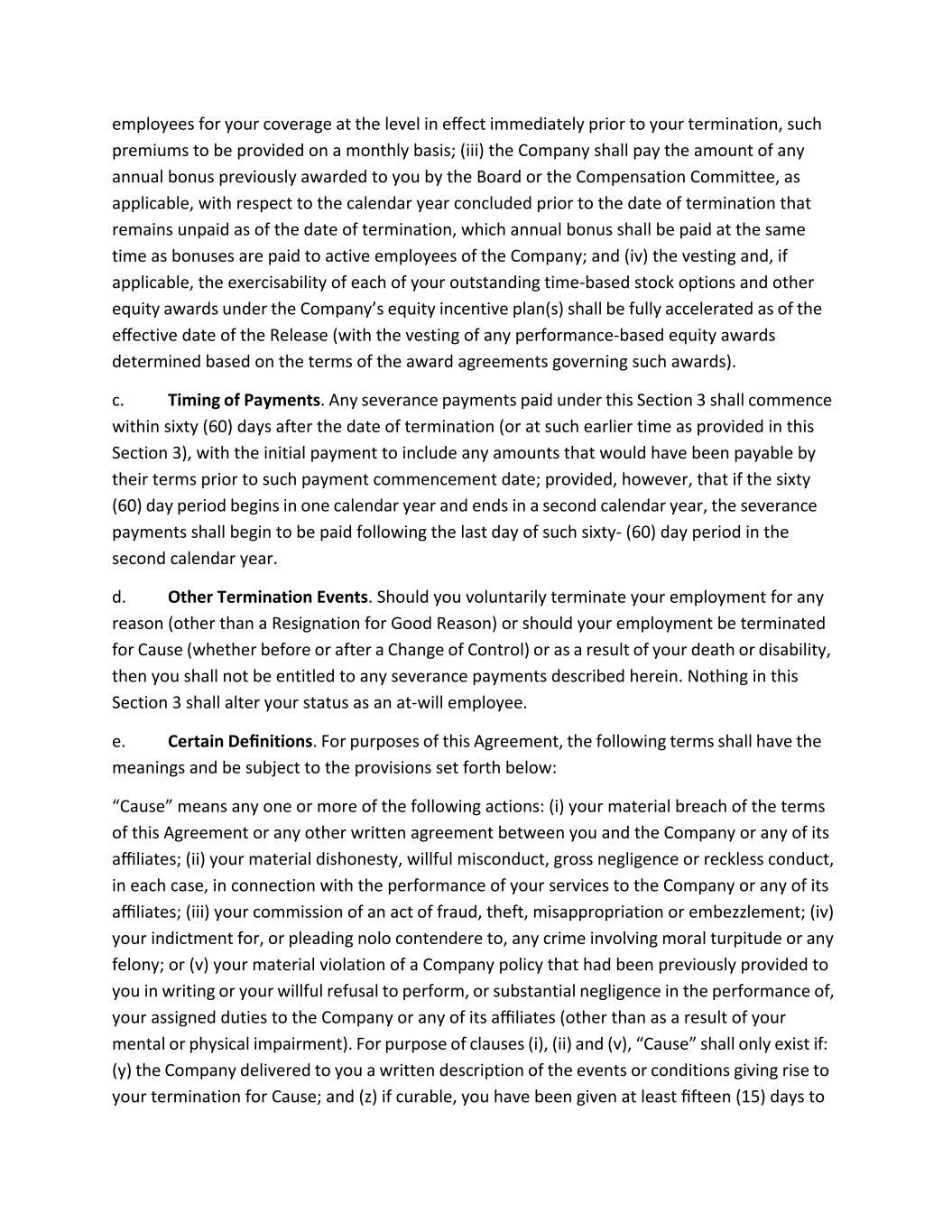 employees for your coverage at the level in effect immediately prior to your termination, such premiums to be provided on a monthly basis; (iii) the Company shall pay the amount of any annual bonus previously awarded to you by the Board or the Compensation Committee, as applicable, with respect to the calendar year concluded prior to the date of termination that remains unpaid as of the date of termination, which annual bonus shall be paid at the same time as bonuses are paid to active employees of the Company; and (iv) the vesting and, if applicable, the exercisability of each of your outstanding time-based stock options and other equity awards under the Company’s equity incentive plan(s) shall be fully accelerated as of the effective date of the Release (with the vesting of any performance-based equity awards determined based on the terms of the award agreements governing such awards). c. Timing of Payments. Any severance payments paid under this Section 3 shall commence within sixty (60) days after the date of termination (or at such earlier time as provided in this Section 3), with the initial payment to include any amounts that would have been payable by their terms prior to such payment commencement date; provided, however, that if the sixty (60) day period begins in one calendar year and ends in a second calendar year, the severance payments shall begin to be paid following the last day of such sixty- (60) day period in the second calendar year. d. Other Termination Events. Should you voluntarily terminate your employment for any reason (other than a Resignation for Good Reason) or should your employment be terminated for Cause (whether before or after a Change of Control) or as a result of your death or disability, then you shall not be entitled to any severance payments described herein. Nothing in this Section 3 shall alter your status as an at-will employee. e. Certain Definitions. For purposes of this Agreement, the following terms shall have the meanings and be subject to the provisions set forth below: “Cause” means any one or more of the following actions: (i) your material breach of the terms of this Agreement or any other written agreement between you and the Company or any of its affiliates; (ii) your material dishonesty, willful misconduct, gross negligence or reckless conduct, in each case, in connection with the performance of your services to the Company or any of its affiliates; (iii) your commission of an act of fraud, theft, misappropriation or embezzlement; (iv) your indictment for, or pleading nolo contendere to, any crime involving moral turpitude or any felony; or (v) your material violation of a Company policy that had been previously provided to you in writing or your willful refusal to perform, or substantial negligence in the performance of, your assigned duties to the Company or any of its affiliates (other than as a result of your mental or physical impairment). For purpose of clauses (i), (ii) and (v), “Cause” shall only exist if: (y) the Company delivered to you a written description of the events or conditions giving rise to your termination for Cause; and (z) if curable, you have been given at least fifteen (15) days to