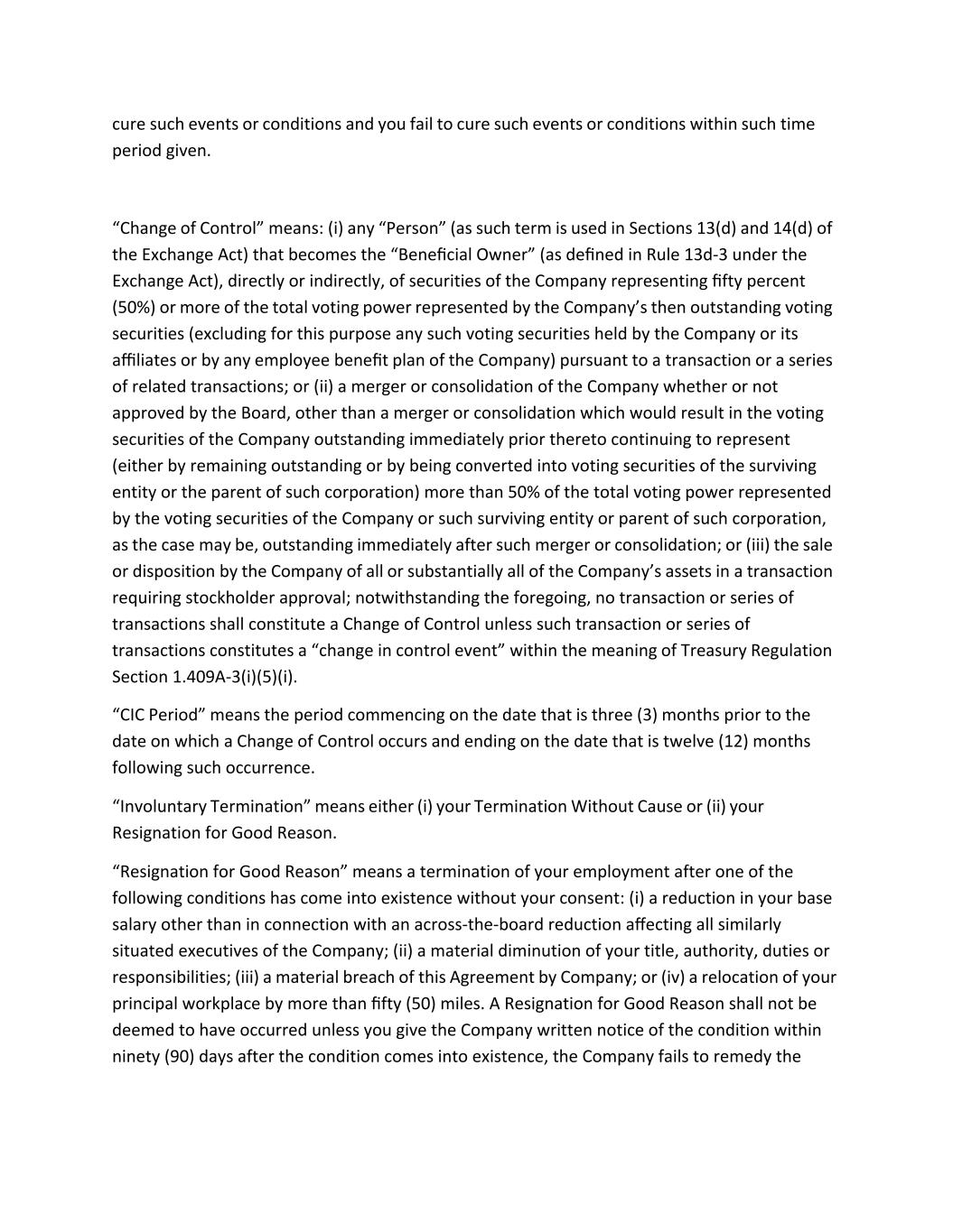 cure such events or conditions and you fail to cure such events or conditions within such time period given. “Change of Control” means: (i) any “Person” (as such term is used in Sections 13(d) and 14(d) of the Exchange Act) that becomes the “Beneficial Owner” (as defined in Rule 13d-3 under the Exchange Act), directly or indirectly, of securities of the Company representing fifty percent (50%) or more of the total voting power represented by the Company’s then outstanding voting securities (excluding for this purpose any such voting securities held by the Company or its affiliates or by any employee benefit plan of the Company) pursuant to a transaction or a series of related transactions; or (ii) a merger or consolidation of the Company whether or not approved by the Board, other than a merger or consolidation which would result in the voting securities of the Company outstanding immediately prior thereto continuing to represent (either by remaining outstanding or by being converted into voting securities of the surviving entity or the parent of such corporation) more than 50% of the total voting power represented by the voting securities of the Company or such surviving entity or parent of such corporation, as the case may be, outstanding immediately after such merger or consolidation; or (iii) the sale or disposition by the Company of all or substantially all of the Company’s assets in a transaction requiring stockholder approval; notwithstanding the foregoing, no transaction or series of transactions shall constitute a Change of Control unless such transaction or series of transactions constitutes a “change in control event” within the meaning of Treasury Regulation Section 1.409A-3(i)(5)(i). “CIC Period” means the period commencing on the date that is three (3) months prior to the date on which a Change of Control occurs and ending on the date that is twelve (12) months following such occurrence. “Involuntary Termination” means either (i) your Termination Without Cause or (ii) your Resignation for Good Reason. “Resignation for Good Reason” means a termination of your employment after one of the following conditions has come into existence without your consent: (i) a reduction in your base salary other than in connection with an across-the-board reduction affecting all similarly situated executives of the Company; (ii) a material diminution of your title, authority, duties or responsibilities; (iii) a material breach of this Agreement by Company; or (iv) a relocation of your principal workplace by more than fifty (50) miles. A Resignation for Good Reason shall not be deemed to have occurred unless you give the Company written notice of the condition within ninety (90) days after the condition comes into existence, the Company fails to remedy the