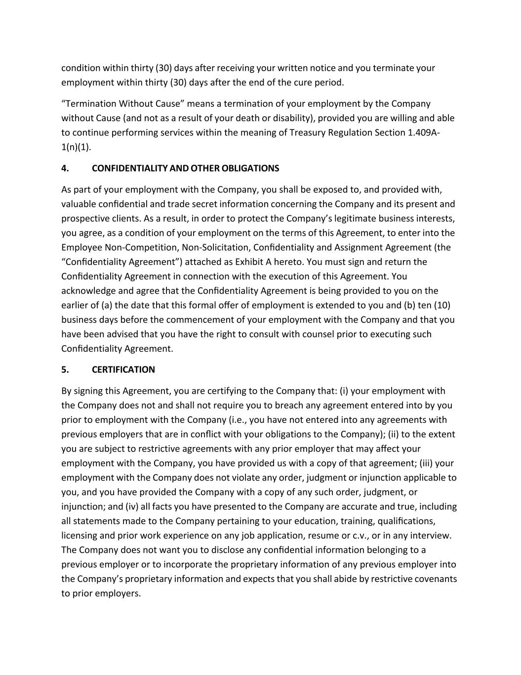 condition within thirty (30) days after receiving your written notice and you terminate your employment within thirty (30) days after the end of the cure period. “Termination Without Cause” means a termination of your employment by the Company without Cause (and not as a result of your death or disability), provided you are willing and able to continue performing services within the meaning of Treasury Regulation Section 1.409A- 1(n)(1). 4. CONFIDENTIALITY AND OTHER OBLIGATIONS As part of your employment with the Company, you shall be exposed to, and provided with, valuable confidential and trade secret information concerning the Company and its present and prospective clients. As a result, in order to protect the Company’s legitimate business interests, you agree, as a condition of your employment on the terms of this Agreement, to enter into the Employee Non-Competition, Non-Solicitation, Confidentiality and Assignment Agreement (the “Confidentiality Agreement”) attached as Exhibit A hereto. You must sign and return the Confidentiality Agreement in connection with the execution of this Agreement. You acknowledge and agree that the Confidentiality Agreement is being provided to you on the earlier of (a) the date that this formal offer of employment is extended to you and (b) ten (10) business days before the commencement of your employment with the Company and that you have been advised that you have the right to consult with counsel prior to executing such Confidentiality Agreement. 5. CERTIFICATION By signing this Agreement, you are certifying to the Company that: (i) your employment with the Company does not and shall not require you to breach any agreement entered into by you prior to employment with the Company (i.e., you have not entered into any agreements with previous employers that are in conflict with your obligations to the Company); (ii) to the extent you are subject to restrictive agreements with any prior employer that may affect your employment with the Company, you have provided us with a copy of that agreement; (iii) your employment with the Company does not violate any order, judgment or injunction applicable to you, and you have provided the Company with a copy of any such order, judgment, or injunction; and (iv) all facts you have presented to the Company are accurate and true, including all statements made to the Company pertaining to your education, training, qualifications, licensing and prior work experience on any job application, resume or c.v., or in any interview. The Company does not want you to disclose any confidential information belonging to a previous employer or to incorporate the proprietary information of any previous employer into the Company’s proprietary information and expects that you shall abide by restrictive covenants to prior employers.