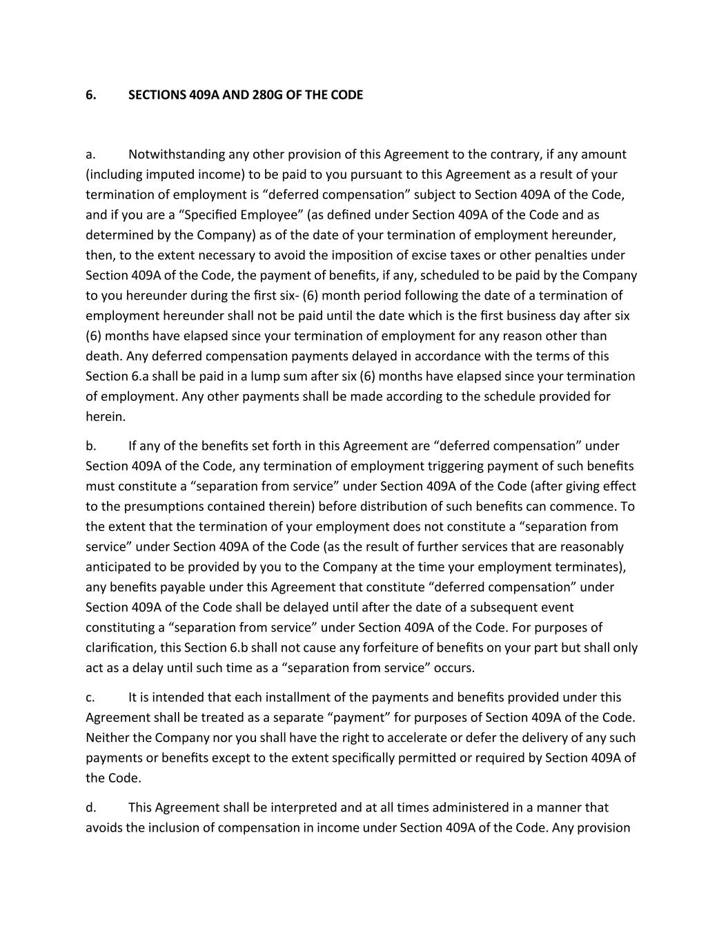 6. SECTIONS 409A AND 280G OF THE CODE a. Notwithstanding any other provision of this Agreement to the contrary, if any amount (including imputed income) to be paid to you pursuant to this Agreement as a result of your termination of employment is “deferred compensation” subject to Section 409A of the Code, and if you are a “Specified Employee” (as defined under Section 409A of the Code and as determined by the Company) as of the date of your termination of employment hereunder, then, to the extent necessary to avoid the imposition of excise taxes or other penalties under Section 409A of the Code, the payment of benefits, if any, scheduled to be paid by the Company to you hereunder during the first six- (6) month period following the date of a termination of employment hereunder shall not be paid until the date which is the first business day after six (6) months have elapsed since your termination of employment for any reason other than death. Any deferred compensation payments delayed in accordance with the terms of this Section 6.a shall be paid in a lump sum after six (6) months have elapsed since your termination of employment. Any other payments shall be made according to the schedule provided for herein. b. If any of the benefits set forth in this Agreement are “deferred compensation” under Section 409A of the Code, any termination of employment triggering payment of such benefits must constitute a “separation from service” under Section 409A of the Code (after giving effect to the presumptions contained therein) before distribution of such benefits can commence. To the extent that the termination of your employment does not constitute a “separation from service” under Section 409A of the Code (as the result of further services that are reasonably anticipated to be provided by you to the Company at the time your employment terminates), any benefits payable under this Agreement that constitute “deferred compensation” under Section 409A of the Code shall be delayed until after the date of a subsequent event constituting a “separation from service” under Section 409A of the Code. For purposes of clarification, this Section 6.b shall not cause any forfeiture of benefits on your part but shall only act as a delay until such time as a “separation from service” occurs. c. It is intended that each installment of the payments and benefits provided under this Agreement shall be treated as a separate “payment” for purposes of Section 409A of the Code. Neither the Company nor you shall have the right to accelerate or defer the delivery of any such payments or benefits except to the extent specifically permitted or required by Section 409A of the Code. d. This Agreement shall be interpreted and at all times administered in a manner that avoids the inclusion of compensation in income under Section 409A of the Code. Any provision