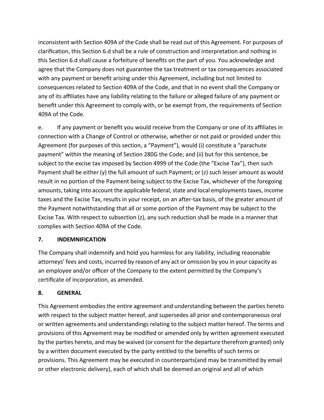 inconsistent with Section 409A of the Code shall be read out of this Agreement. For purposes of clarification, this Section 6.d shall be a rule of construction and interpretation and nothing in this Section 6.d shall cause a forfeiture of benefits on the part of you. You acknowledge and agree that the Company does not guarantee the tax treatment or tax consequences associated with any payment or benefit arising under this Agreement, including but not limited to consequences related to Section 409A of the Code, and that in no event shall the Company or any of its affiliates have any liability relating to the failure or alleged failure of any payment or benefit under this Agreement to comply with, or be exempt from, the requirements of Section 409A of the Code. e. If any payment or benefit you would receive from the Company or one of its affiliates in connection with a Change of Control or otherwise, whether or not paid or provided under this Agreement (for purposes of this section, a “Payment”), would (i) constitute a “parachute payment” within the meaning of Section 280G the Code; and (ii) but for this sentence, be subject to the excise tax imposed by Section 4999 of the Code (the “Excise Tax”), then such Payment shall be either (y) the full amount of such Payment; or (z) such lesser amount as would result in no portion of the Payment being subject to the Excise Tax, whichever of the foregoing amounts, taking into account the applicable federal, state and local employments taxes, income taxes and the Excise Tax, results in your receipt, on an after-tax basis, of the greater amount of the Payment notwithstanding that all or some portion of the Payment may be subject to the Excise Tax. With respect to subsection (z), any such reduction shall be made in a manner that complies with Section 409A of the Code. 7. INDEMNIFICATION The Company shall indemnify and hold you harmless for any liability, including reasonable attorneys’ fees and costs, incurred by reason of any act or omission by you in your capacity as an employee and/or officer of the Company to the extent permitted by the Company’s certificate of incorporation, as amended. 8. GENERAL This Agreement embodies the entire agreement and understanding between the parties hereto with respect to the subject matter hereof, and supersedes all prior and contemporaneous oral or written agreements and understandings relating to the subject matter hereof. The terms and provisions of this Agreement may be modified or amended only by written agreement executed by the parties hereto, and may be waived (or consent for the departure therefrom granted) only by a written document executed by the party entitled to the benefits of such terms or provisions. This Agreement may be executed in counterparts(and may be transmitted by email or other electronic delivery), each of which shall be deemed an original and all of which