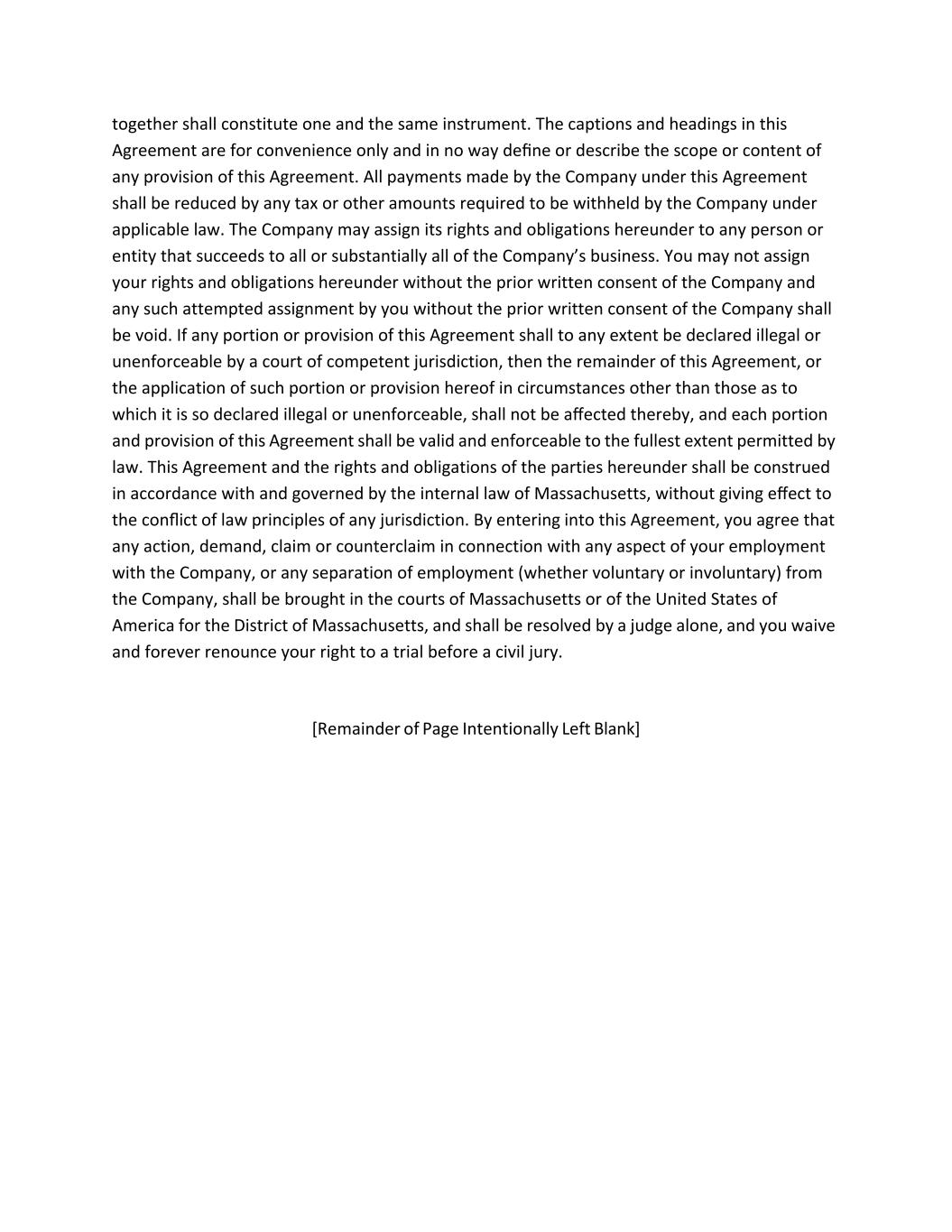 together shall constitute one and the same instrument. The captions and headings in this Agreement are for convenience only and in no way define or describe the scope or content of any provision of this Agreement. All payments made by the Company under this Agreement shall be reduced by any tax or other amounts required to be withheld by the Company under applicable law. The Company may assign its rights and obligations hereunder to any person or entity that succeeds to all or substantially all of the Company’s business. You may not assign your rights and obligations hereunder without the prior written consent of the Company and any such attempted assignment by you without the prior written consent of the Company shall be void. If any portion or provision of this Agreement shall to any extent be declared illegal or unenforceable by a court of competent jurisdiction, then the remainder of this Agreement, or the application of such portion or provision hereof in circumstances other than those as to which it is so declared illegal or unenforceable, shall not be affected thereby, and each portion and provision of this Agreement shall be valid and enforceable to the fullest extent permitted by law. This Agreement and the rights and obligations of the parties hereunder shall be construed in accordance with and governed by the internal law of Massachusetts, without giving effect to the conflict of law principles of any jurisdiction. By entering into this Agreement, you agree that any action, demand, claim or counterclaim in connection with any aspect of your employment with the Company, or any separation of employment (whether voluntary or involuntary) from the Company, shall be brought in the courts of Massachusetts or of the United States of America for the District of Massachusetts, and shall be resolved by a judge alone, and you waive and forever renounce your right to a trial before a civil jury. [Remainder of Page Intentionally Left Blank]