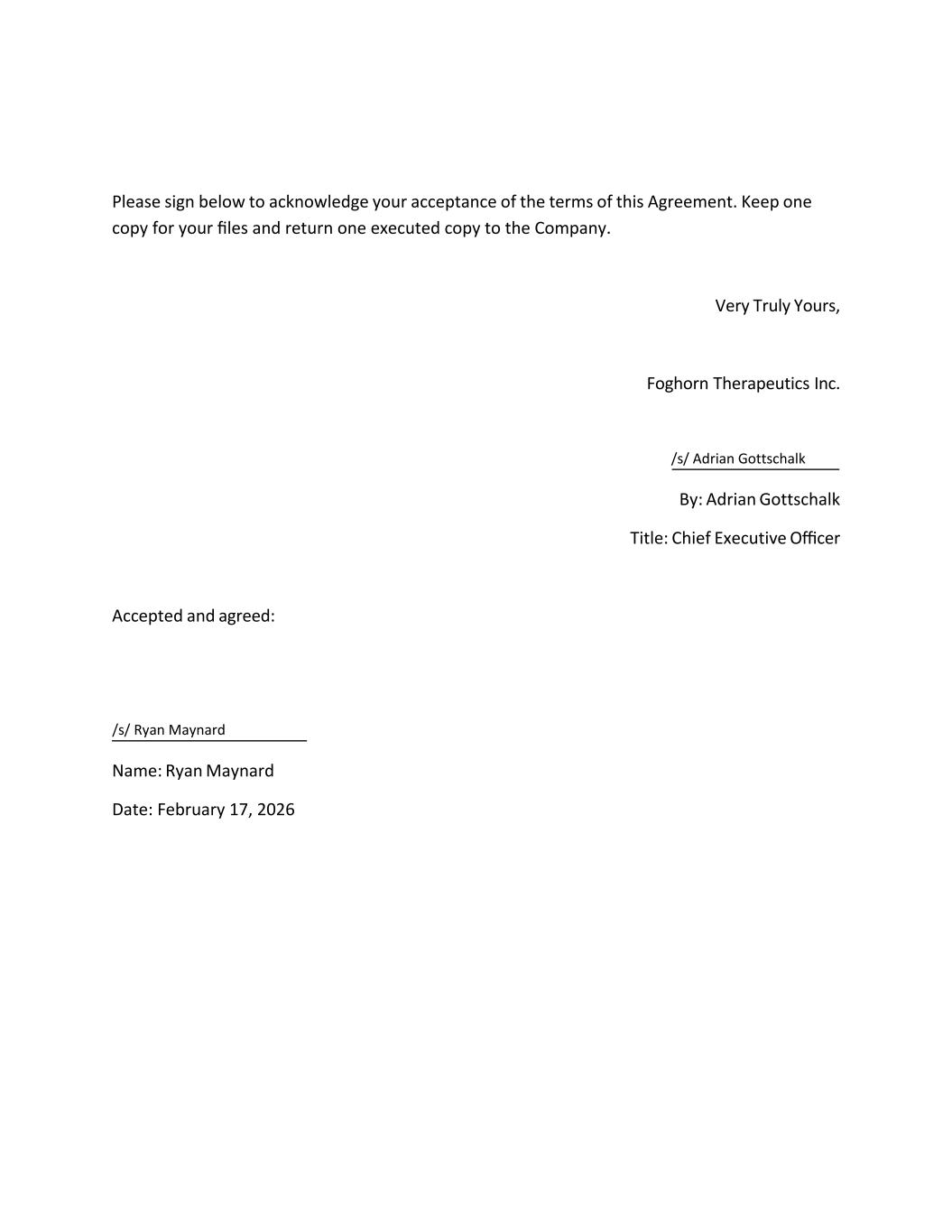 Please sign below to acknowledge your acceptance of the terms of this Agreement. Keep one copy for your files and return one executed copy to the Company. Very Truly Yours, Foghorn Therapeutics Inc. /s/ Adrian Gottschalk By: Adrian Gottschalk Title: Chief Executive Officer Accepted and agreed: /s/ Ryan Maynard Name: Ryan Maynard Date: February 17, 2026