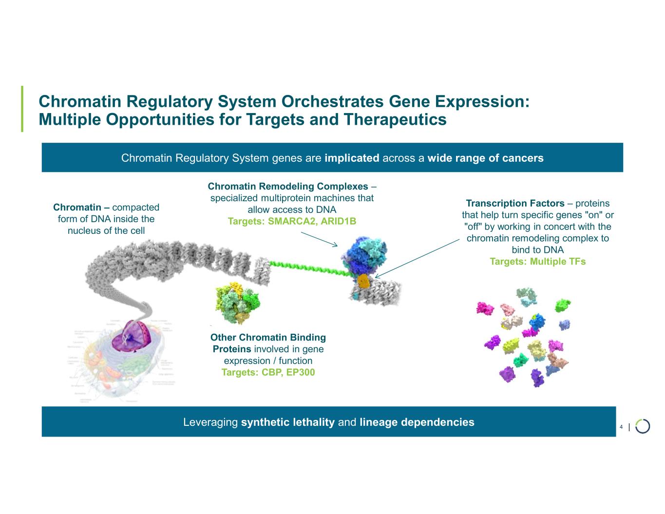 | Foghorn is a Leader in Chromatin Biology, Successfully Drugging Challenging Targets 3 Targeting chromatin regulation Implicated in up to 50% of all tumors Multi-billion $ Opportunities Unlocking selectivity of previously undruggable targets First-and-Best-in-Class Approaches Innovating selective protein degradation with capabilities in induced proximity Selective Target Engagement Leveraging a proven drug development platform with expansive potential Strategic Partnership: Multiple Programs