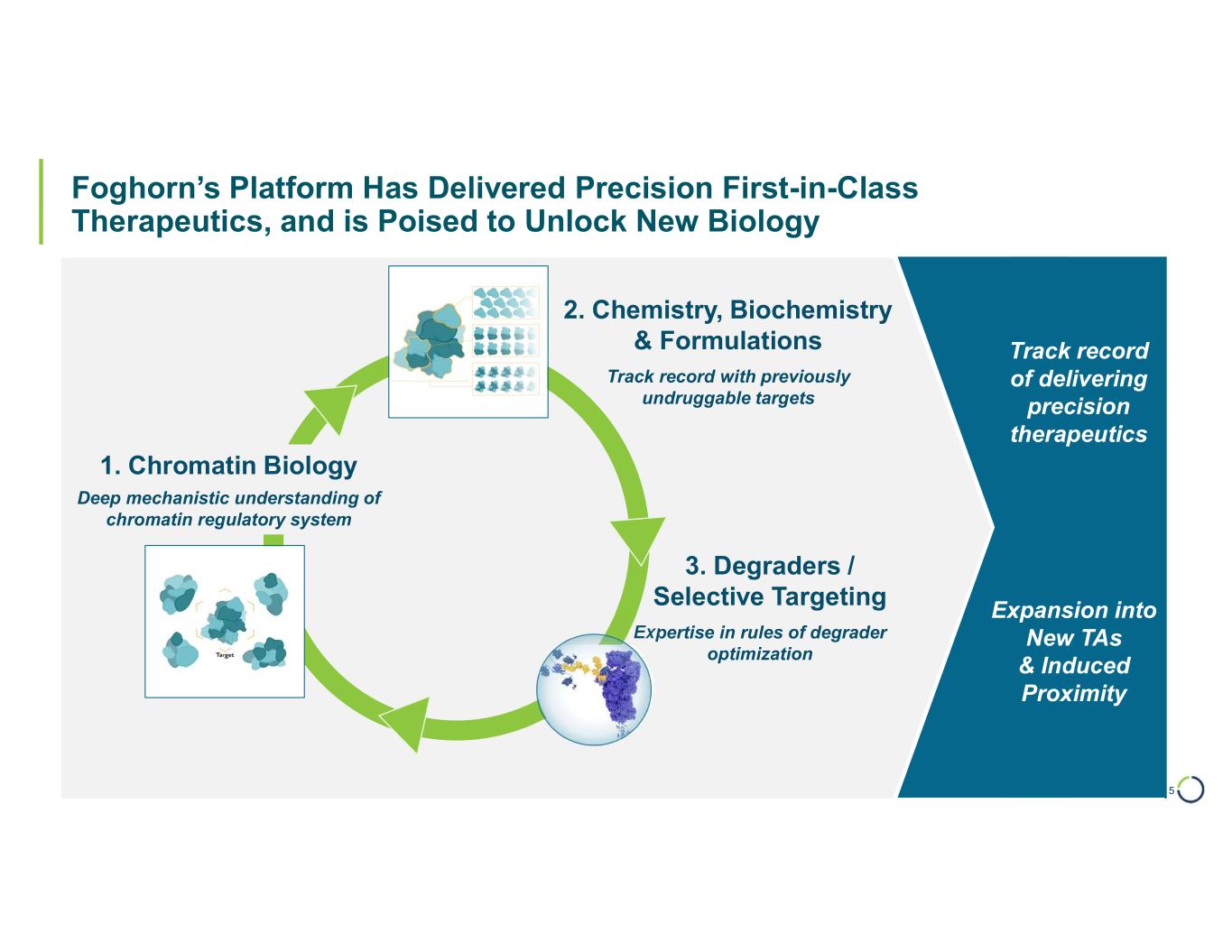 | Chromatin Regulatory System Orchestrates Gene Expression: Multiple Opportunities for Targets and Therapeutics 4 Chromatin – compacted form of DNA inside the nucleus of the cell Chromatin Remodeling Complexes – specialized multiprotein machines that allow access to DNA Targets: SMARCA2, ARID1B Transcription Factors – proteins that help turn specific genes "on" or "off" by working in concert with the chromatin remodeling complex to bind to DNA Targets: Multiple TFs Other Chromatin Binding Proteins involved in gene expression / function Targets: CBP, EP300 Chromatin Regulatory System genes are implicated across a wide range of cancers Leveraging synthetic lethality and lineage dependencies