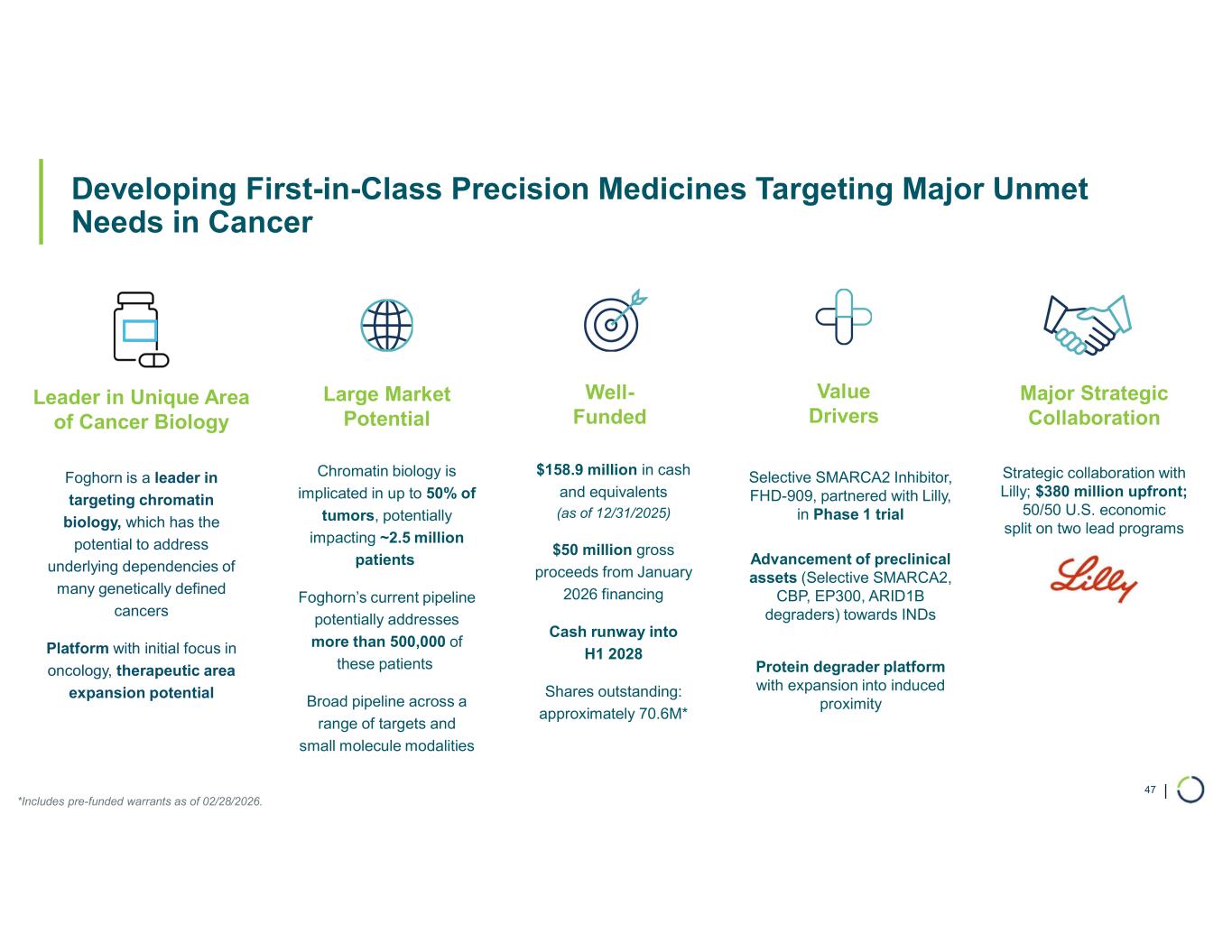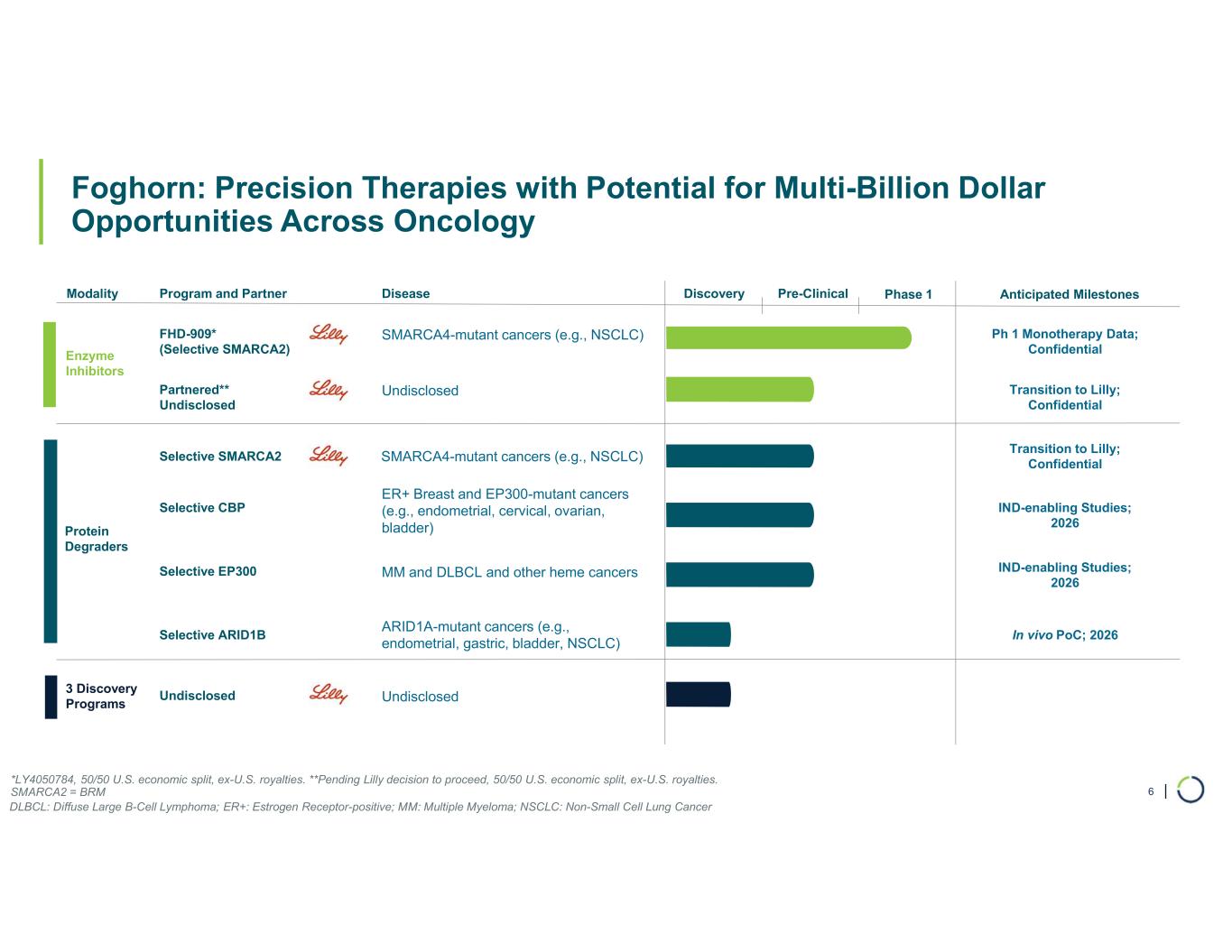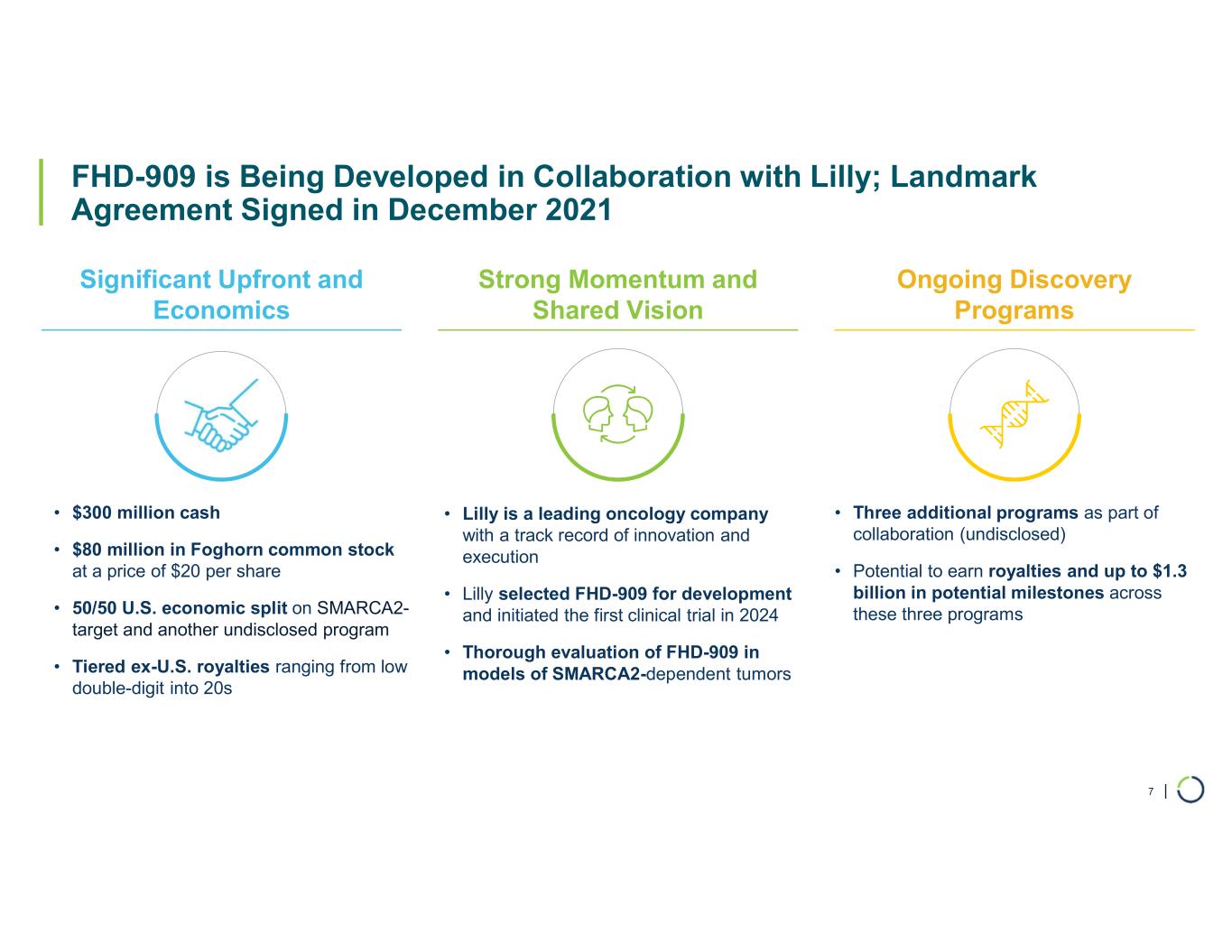 | Foghorn: Precision Therapies with Potential for Multi-Billion Dollar Opportunities Across Oncology 6 Modality Program and Partner Phase 1 Enzyme Inhibitors Protein Degraders FHD-909* (Selective SMARCA2) 3 Discovery Programs Undisclosed Partnered** Undisclosed Disease SMARCA4-mutant cancers (e.g., NSCLC) Selective SMARCA2 SMARCA4-mutant cancers (e.g., NSCLC) Selective ARID1B ARID1A-mutant cancers (e.g., endometrial, gastric, bladder, NSCLC) Selective CBP ER+ Breast and EP300-mutant cancers (e.g., endometrial, cervical, ovarian, bladder) Selective EP300 MM and DLBCL and other heme cancers Undisclosed Undisclosed Pre-Clinical Anticipated MilestonesDiscovery *LY4050784, 50/50 U.S. economic split, ex-U.S. royalties. **Pending Lilly decision to proceed, 50/50 U.S. economic split, ex-U.S. royalties. SMARCA2 = BRM DLBCL: Diffuse Large B-Cell Lymphoma; ER+: Estrogen Receptor-positive; MM: Multiple Myeloma; NSCLC: Non-Small Cell Lung Cancer Ph 1 Monotherapy Data; Confidential Transition to Lilly; Confidential IND-enabling Studies; 2026 Transition to Lilly; Confidential IND-enabling Studies; 2026 In vivo PoC; 2026