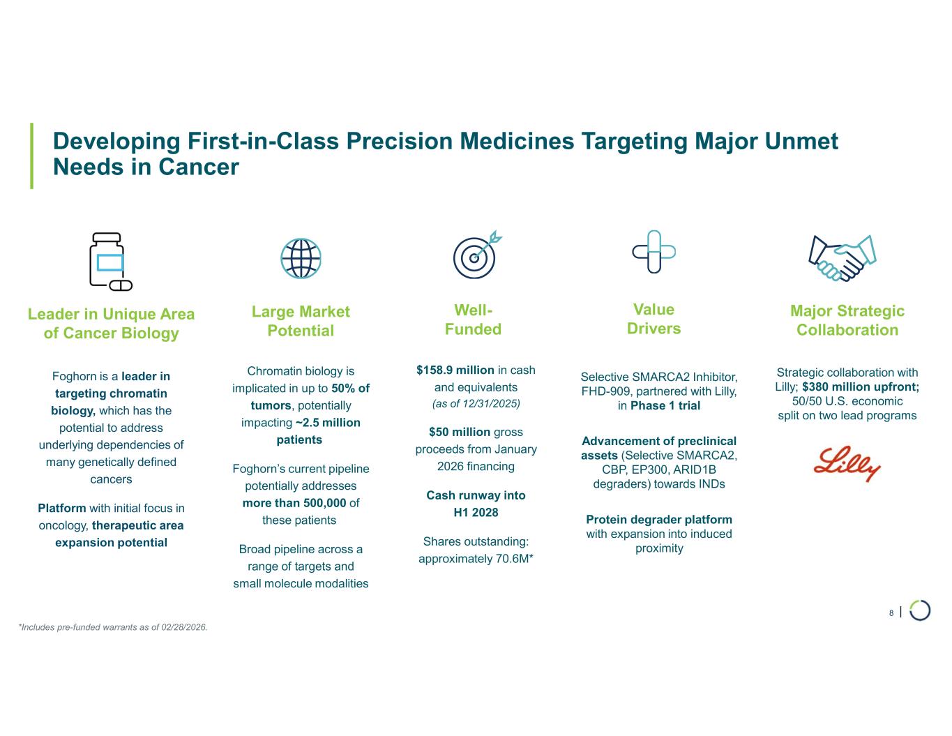 | FHD-909 is Being Developed in Collaboration with Lilly; Landmark Agreement Signed in December 2021 Significant Upfront and Economics Strong Momentum and Shared Vision Ongoing Discovery Programs • $300 million cash • $80 million in Foghorn common stock at a price of $20 per share • 50/50 U.S. economic split on SMARCA2- target and another undisclosed program • Tiered ex-U.S. royalties ranging from low double-digit into 20s • Lilly is a leading oncology company with a track record of innovation and execution • Lilly selected FHD-909 for development and initiated the first clinical trial in 2024 • Thorough evaluation of FHD-909 in models of SMARCA2-dependent tumors • Three additional programs as part of collaboration (undisclosed) • Potential to earn royalties and up to $1.3 billion in potential milestones across these three programs 7