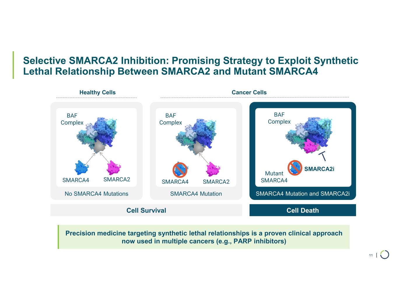 | Selective SMARCA2 Inhibition: Promising Strategy to Exploit Synthetic Lethal Relationship Between SMARCA2 and Mutant SMARCA4 11 No SMARCA4 Mutations SMARCA4 Mutation SMARCA4 Mutation and SMARCA2i Cell Survival Cell Death Healthy Cells Cancer Cells SMARCA4 SMARCA2 BAF Complex BAF Complex Mutant SMARCA4 BAF Complex SMARCA2i Precision medicine targeting synthetic lethal relationships is a proven clinical approach now used in multiple cancers (e.g., PARP inhibitors) SMARCA4 SMARCA2