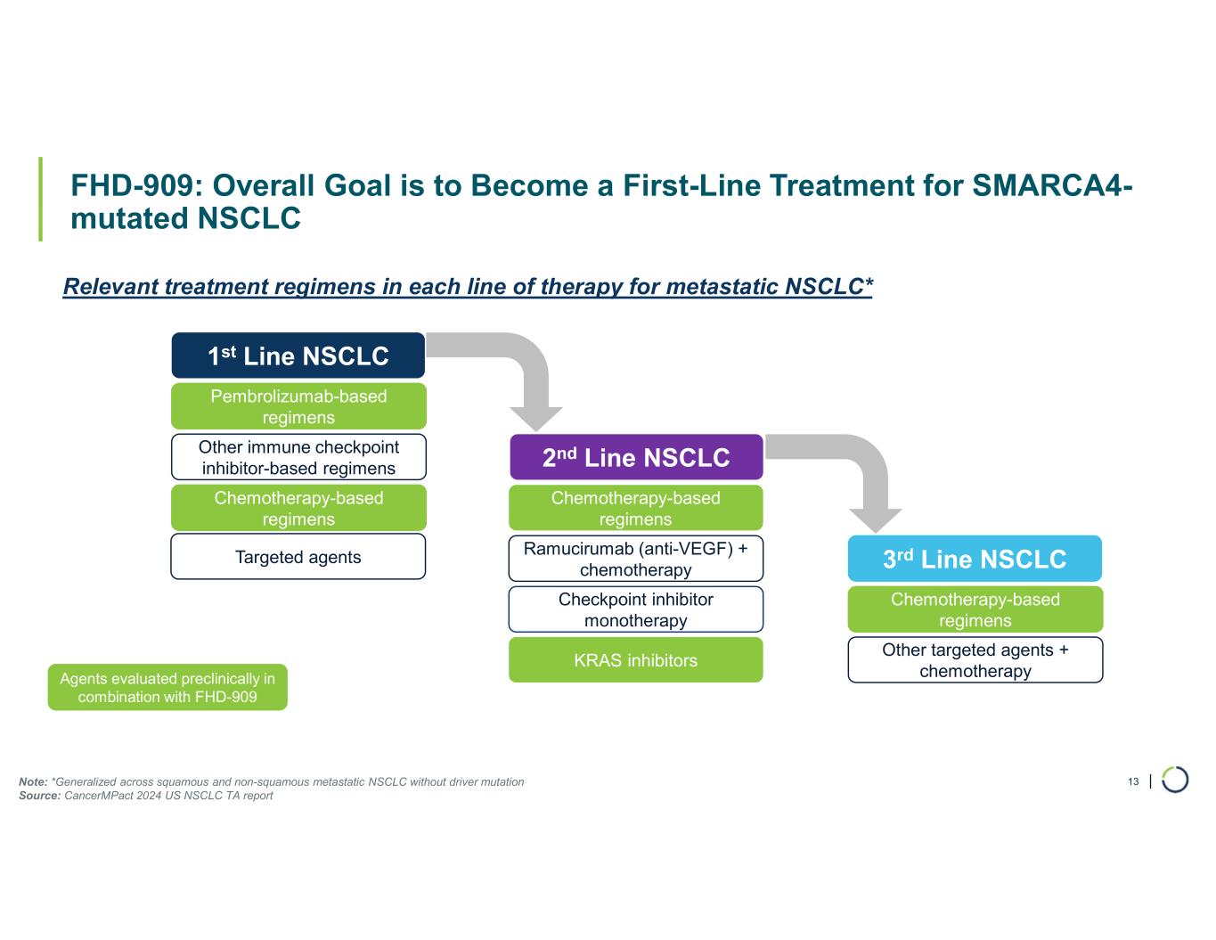 | FHD-909: Overall Goal is to Become a First-Line Treatment for SMARCA4- mutated NSCLC 13 1st Line NSCLC Pembrolizumab-based regimens Other immune checkpoint inhibitor-based regimens Chemotherapy-based regimens 2nd Line NSCLC Chemotherapy-based regimens Ramucirumab (anti-VEGF) + chemotherapy Checkpoint inhibitor monotherapy 3rd Line NSCLC Chemotherapy-based regimens Other targeted agents + chemotherapy Relevant treatment regimens in each line of therapy for metastatic NSCLC* Agents evaluated preclinically in combination with FHD-909 KRAS inhibitors Targeted agents Note: *Generalized across squamous and non-squamous metastatic NSCLC without driver mutation Source: CancerMPact 2024 US NSCLC TA report