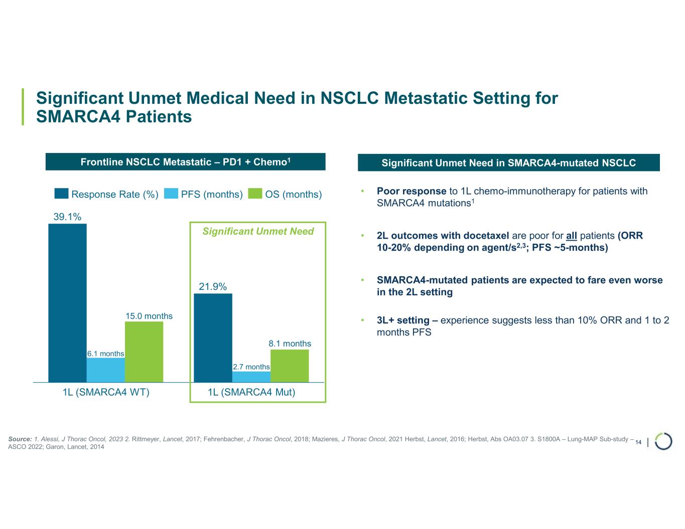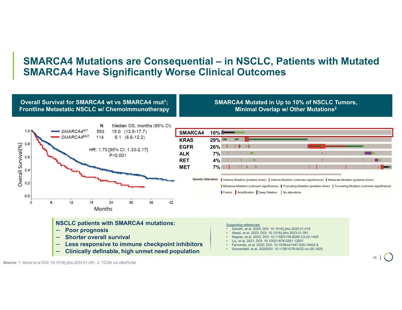 | 14 Significant Unmet Medical Need in NSCLC Metastatic Setting for SMARCA4 Patients ~15 months ~8 months 1L (SMARCA4 WT) 1L (SMARCA4 Mut) 39.1% 21.9% 2.7 months Response Rate (%) PFS (months) OS (months) Significant Unmet Need Frontline NSCLC Metastatic – PD1 + Chemo1 Source: 1. Alessi, J Thorac Oncol, 2023 2. Rittmeyer, Lancet, 2017; Fehrenbacher, J Thorac Oncol, 2018; Mazieres, J Thorac Oncol, 2021 Herbst, Lancet, 2016; Herbst, Abs OA03.07 3. S1800A – Lung-MAP Sub-study – ASCO 2022; Garon, Lancet, 2014 • Poor response to 1L chemo-immunotherapy for patients with SMARCA4 mutations1 • 2L outcomes with docetaxel are poor for all patients (ORR 10-20% depending on agent/s2,3; PFS ~5-months) • SMARCA4-mutated patients are expected to fare even worse in the 2L setting • 3L+ setting – experience suggests less than 10% ORR and 1 to 2 months PFS Significant Unmet Need in SMARCA4-mutated NSCLC 8.1 t 6.1 months 15.0 t s