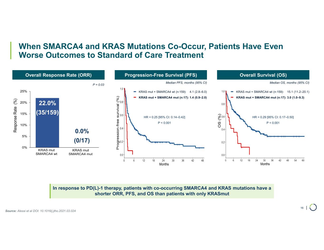 | NSCLC patients with SMARCA4 mutations: ─ Poor prognosis ─ Shorter overall survival ─ Less responsive to immune checkpoint inhibitors ─ Clinically definable, high unmet need population SMARCA4 Mutated in Up to 10% of NSCLC Tumors, Minimal Overlap w/ Other Mutations2 Overall Survival for SMARCA4 wt vs SMARCA4 mut1; Frontline Metastatic NSCLC w/ Chemoimmunotherapy SMARCA4 Mutations are Consequential – in NSCLC, Patients with Mutated SMARCA4 Have Significantly Worse Clinical Outcomes 15 SMARCA4 10% KRAS 29% EGFR 26% ALK 7% RET 4% MET 7% Source: 1. Alessi et al DOI: 10.1016/j.jtho.2023.01.091; 2. TCGA via cBioPortal O ve ra ll Su rv iv al (% ) Months Supporting references: • Gandhi, et al, 2025; DOI: 10.1016/j.jtho.2025.01.016 • Alessi, et al, 2023; DOI: 10.1016/j.jtho.2023.01.091 • Negrao, et al, 2023; DOI: 10.1158/2159-8290.Cd-22-1420 • Liu, et al, 2021; DOI: 10.1002/1878-0261.12831 • Fernando, et al, 2020; DOI: 10.1038/s41467-020-19402-8 • Schoenfeld, et al, 2020DOI: 10.1158/1078-0432.ccr-20-1825