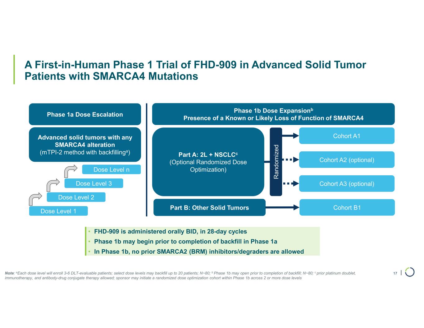 | A First-in-Human Phase 1 Trial of FHD-909 in Advanced Solid Tumor Patients with SMARCA4 Mutations Phase 1a Dose Escalation Advanced solid tumors with any SMARCA4 alteration (mTPI-2 method with backfillinga) Dose Level 1 Dose Level 2 Dose Level 3 Dose Level n Phase 1b Dose Expansionb Presence of a Known or Likely Loss of Function of SMARCA4 Part A: 2L + NSCLCc (Optional Randomized Dose Optimization) Part B: Other Solid Tumors Cohort A1 Cohort A2 (optional) Cohort A3 (optional) R an d om iz ed Cohort B1 • FHD-909 is administered orally BID, in 28-day cycles • Phase 1b may begin prior to completion of backfill in Phase 1a • In Phase 1b, no prior SMARCA2 (BRM) inhibitors/degraders are allowed Note: aEach dose level will enroll 3-6 DLT-evaluable patients; select dose levels may backfill up to 20 patients; N~80; b Phase 1b may open prior to completion of backfill; N~80; c prior platinum doublet, immunotherapy, and antibody-drug conjugate therapy allowed; sponsor may initiate a randomized dose optimization cohort within Phase 1b across 2 or more dose levels 17