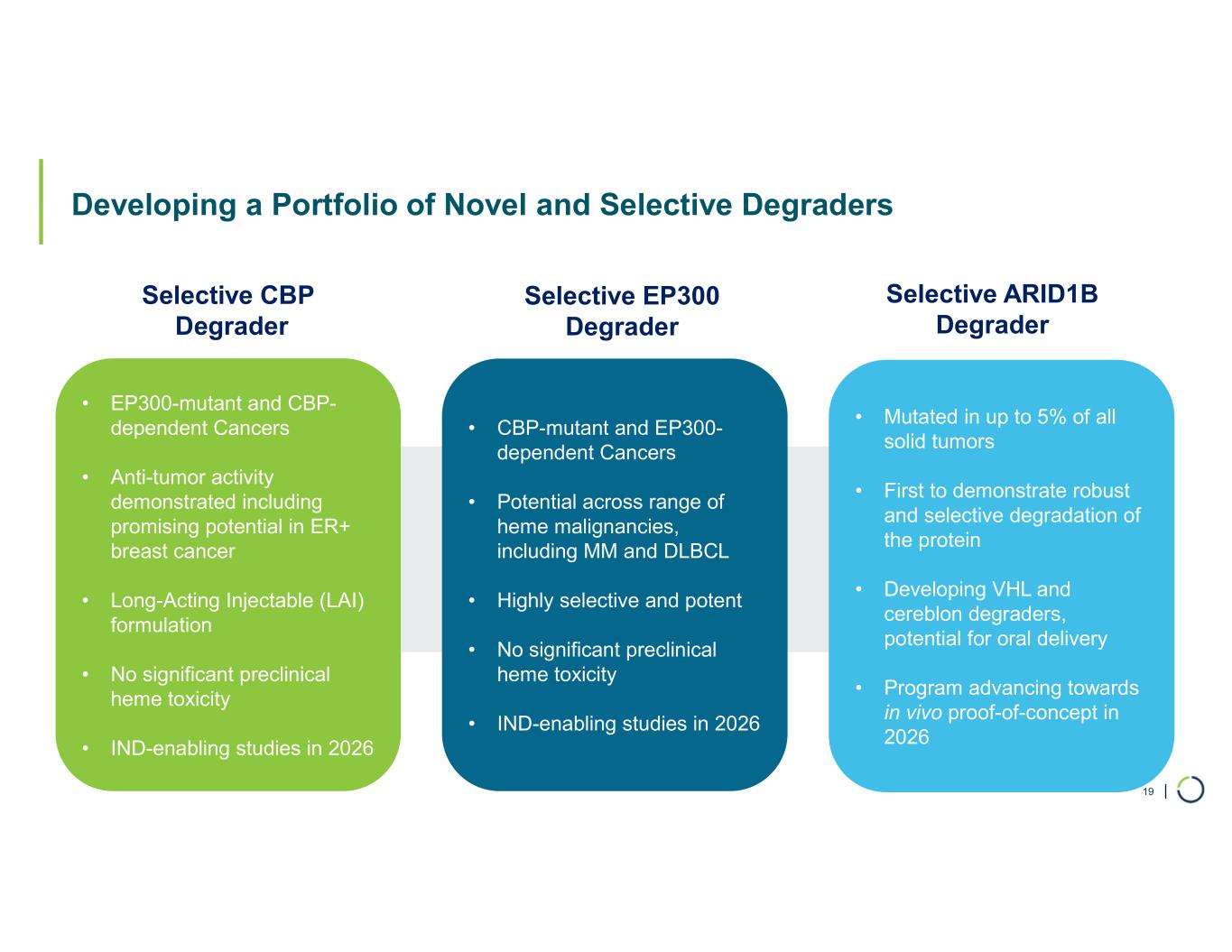 Degrader Programs • Selective CBP Degrader • Selective EP300 Degrader • Selective ARID1B Degrader 18