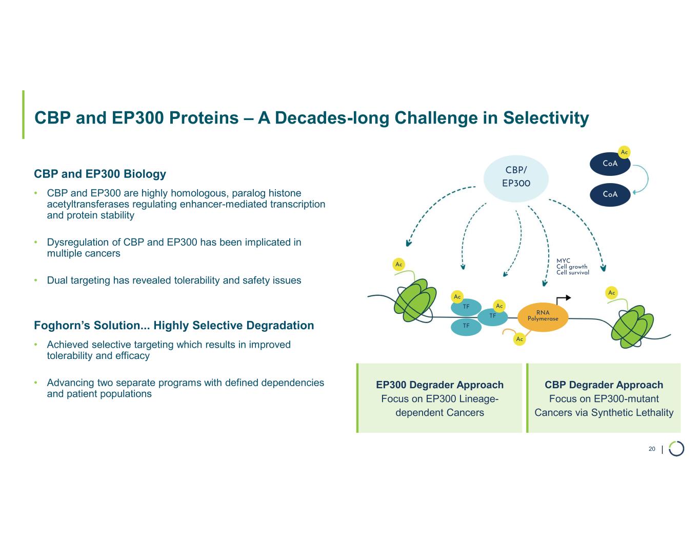 | Developing a Portfolio of Novel and Selective Degraders 19 Selective ARID1B Degrader Selective CBP Degrader • Mutated in up to 5% of all solid tumors • First to demonstrate robust and selective degradation of the protein • Developing VHL and cereblon degraders, potential for oral delivery • Program advancing towards in vivo proof-of-concept in 2026 • EP300-mutant and CBP- dependent Cancers • Anti-tumor activity demonstrated including promising potential in ER+ breast cancer • Long-Acting Injectable (LAI) formulation • No significant preclinical heme toxicity • IND-enabling studies in 2026 • CBP-mutant and EP300- dependent Cancers • Potential across range of heme malignancies, including MM and DLBCL • Highly selective and potent • No significant preclinical heme toxicity • IND-enabling studies in 2026 Selective EP300 Degrader